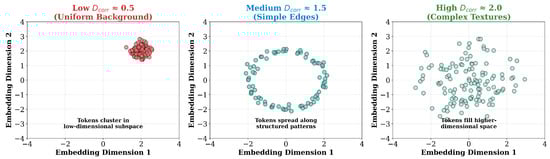 Conceptual illustration of correlation dimension for different token types. (Left) Low : Embeddings from uniform background regions cluster tightly in low-dimensional subspace, indicating redundant information. (Center) Medium : Embeddings from simple edges spread along structured patterns. (Right) High : Embeddings from complex textures fill higher-dimensional space, reflecting rich information content. The correlation dimension quantifies this geometric complexity independent of attention patterns.