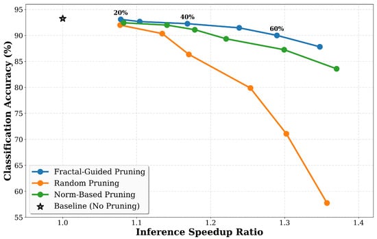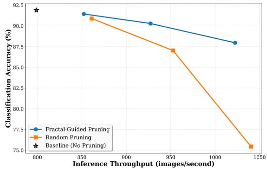 The throughput versus accuracy trade-off analysis presented in Figure 11 shows that fractal pruning achieves computational benefits while maintaining higher accuracy. The baseline without pruning achieves 91.90% accuracy at 799 images per second throughput on CIFAR-10. At 20% pruning, fractal achieves 91.44% accuracy at 852 images per second, representing a 1.07× speedup with only 0.46 percentage points accuracy loss, while random achieves 90.89% accuracy at 861 images per second with 1.01 percentage points accuracy loss. At 40% pruning, fractal achieves 90.29% accuracy at 927 images per second, representing a 1.16× speedup with 1.61 percentage points accuracy loss, while random achieves 87.03% accuracy at 952 images per second with 4.87 percentage points accuracy loss. This represents a 3.26 percentage point accuracy advantage at similar computational cost. At 60% pruning, fractal achieves 87.96% accuracy at 1022 images per second, representing a 1.28× speedup with 3.94 percentage points accuracy loss, while random achieves 75.44% accuracy at 1040 images per second with 16.46 percentage points accuracy loss. The pattern across all pruning ratios confirms that fractal-guided pruning provides efficiency gains suitable for deployment in resource-constrained environments while maintaining higher accuracy than random pruning at equivalent throughput levels.