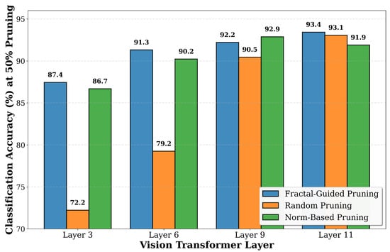 The layer-wise analysis shows patterns in how different pruning methods interact with the hierarchical structure of Vision Transformers. The advantage of fractal pruning over random pruning is most pronounced at early and middle layers, with 15.22 percentage points at Layer 3 and 12.07 percentage points at Layer 6, while the gap narrows at deeper layers to 1.75 percentage points at Layer 9 and 0.36 percentage points at Layer 11. This pattern suggests that fractal dimension is particularly effective at identifying important tokens in early and middle layers where visual features are being extracted and semantic representations are being formed. At deeper layers, the representations become more refined and task-specific, reducing the relative advantage of geometry-based importance measures. The accuracy of fractal pruning across all layers, ranging from 87.44% at Layer 3 to 93.43% at Layer 11, shows that the method is robust to the choice of pruning layer and can be applied flexibly depending on the desired accuracy–efficiency trade-off.