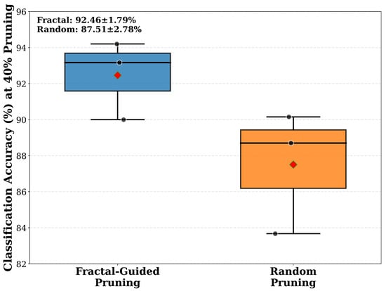Statistical robustness analysis across multiple random seeds confirms that the observed advantages of fractal-guided pruning are not artifacts of particular initialization or data ordering. Figure 9 presents box plots showing the distribution of classification accuracy at forty percent pruning across three independent experimental runs with different random seeds. For fractal pruning, the three runs achieve accuracies of 93.17%, 94.20%, and 90.00%, yielding a mean accuracy of 92.46% with standard deviation of 1.79%. For random pruning, the three runs achieve accuracies of 88.70%, 90.15%, and 83.67%, yielding a mean accuracy of 87.51% with standard deviation of 2.78%. The 4.95 percentage point advantage in mean accuracy is consistent across experimental conditions, and the lower variance of fractal pruning indicates more stable performance. The minimum fractal accuracy of 90.00% is comparable to the maximum random accuracy of 90.15%, showing that even the worst-case fractal performance matches the best-case random performance. The interquartile ranges shown in the box plots further confirm the consistency of fractal pruning, with a tighter distribution of accuracy values compared to random pruning.