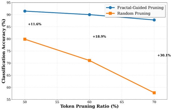 Evaluation in extreme pruning regimes where fifty percent or more tokens are removed provides insights into the scalability of fractal-guided token selection. Figure 10 focuses on pruning ratios of fifty, sixty, and seventy percent, where token selection becomes most challenging and the differences between methods are most pronounced. At 50% pruning, fractal achieves 91.46% accuracy with a 1.79 percentage point drop from the 93.25% baseline, while random achieves 79.87% accuracy with a 13.38 percentage point drop, representing an 11.59 percentage point advantage for fractal. At 60% pruning, fractal achieves 90.01% accuracy with a 3.24 percentage point drop, while random achieves 71.07% accuracy with a 22.18 percentage point drop, yielding an 18.94 percentage point advantage. At 70% pruning, fractal maintains 87.81% accuracy with a 5.44 percentage point drop, while random collapses to 57.76% accuracy with a 35.49 percentage point drop, resulting in a 30.05 percentage point advantage. The increasing advantage at higher pruning ratios shows that fractal dimension becomes increasingly valuable as the pruning constraint becomes more severe. The fact that fractal pruning retains 87.81% accuracy even when removing 70% of tokens shows that correlation dimension identifies the small subset of tokens carrying the majority of information content.