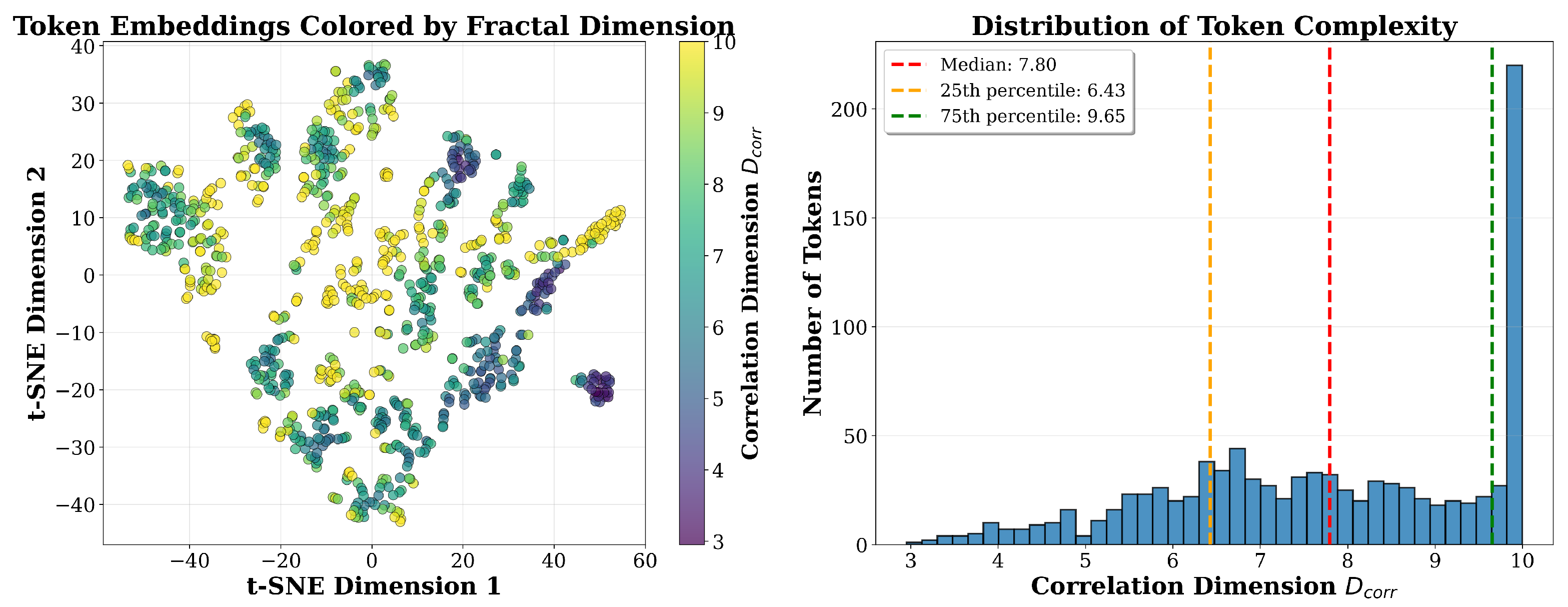 The visualization reveals several key findings. First, tokens exhibit a broad range of correlation dimensions spanning from approximately 3 to 10, with median (25th percentile: 6.43, 75th percentile: 9.65). This wide distribution confirms substantial variability in token complexity within a single layer, providing a rich signal for importance-based pruning. Second, tokens with lower values (purple, 3–5 range) tend to form denser clusters in the embedding space, while tokens with higher values (yellow-green, 9–10 range) are more dispersed across the representation space. This spatial structure validates our geometric intuition: tokens representing redundant information cluster together, while tokens encoding diverse information spread apart. Third, the continuous distribution (rather than discrete modes) enables fine-grained importance ranking suitable for flexible pruning ratios from 10% to 70%.