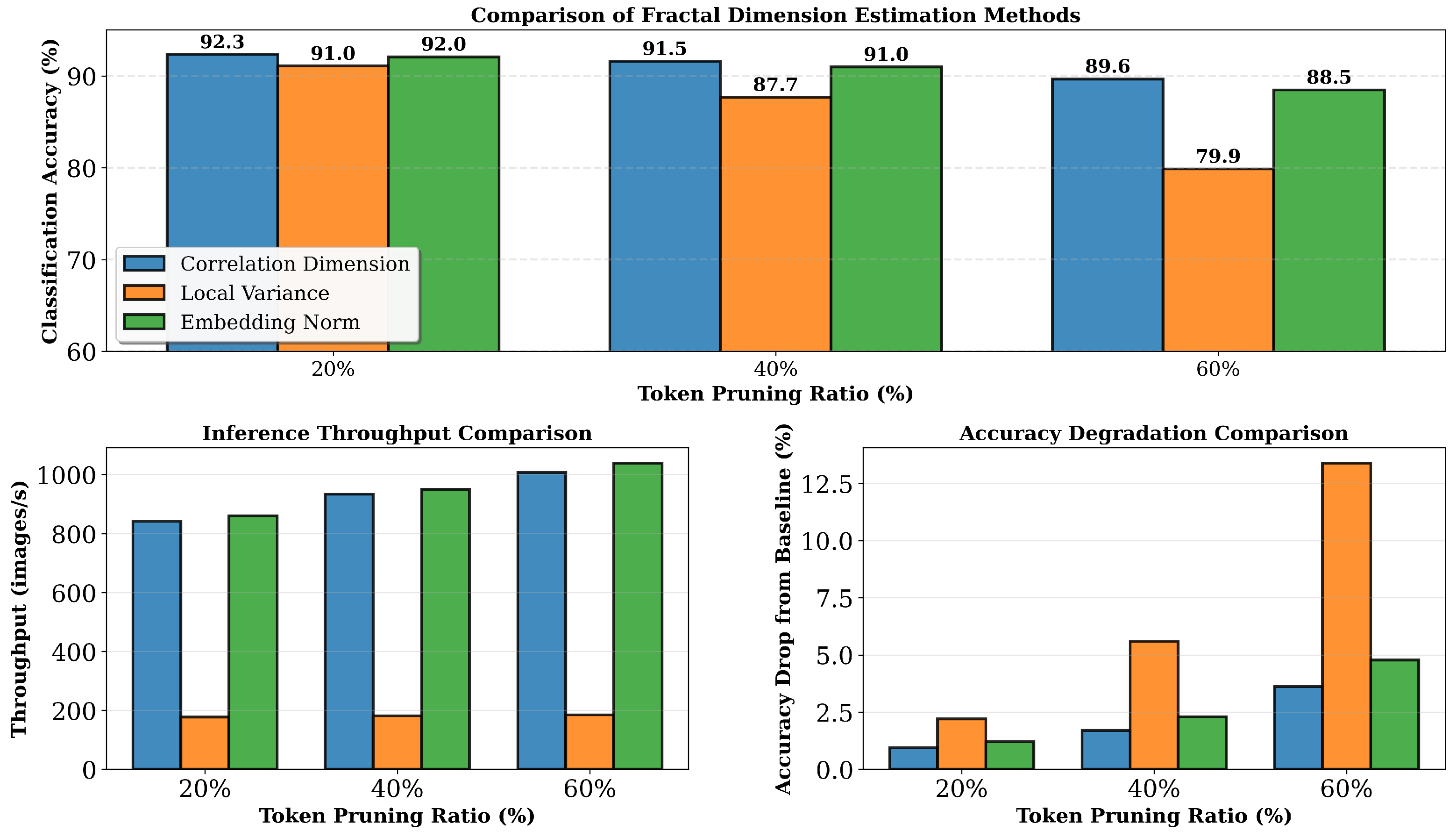 The results demonstrate clear advantages for correlation dimension. At 20% pruning, correlation dimension achieves 92.31% accuracy compared to 91.05% for local variance and 92.04% for embedding norm, representing a 1.26 percentage point advantage over variance. At 40% pruning, the gap widens substantially with correlation dimension achieving 91.55% versus 87.66% for variance and 90.95% for norm—a 3.89 percentage point advantage. At 60% pruning, correlation dimension maintains 89.64% accuracy, while variance degrades to 79.86%, demonstrating a 9.78 percentage point gap. These results validate that correlation dimension’s power-law scaling analysis captures token importance more effectively than simpler geometric measures, particularly at higher pruning ratios where accurate importance ranking becomes critical.
