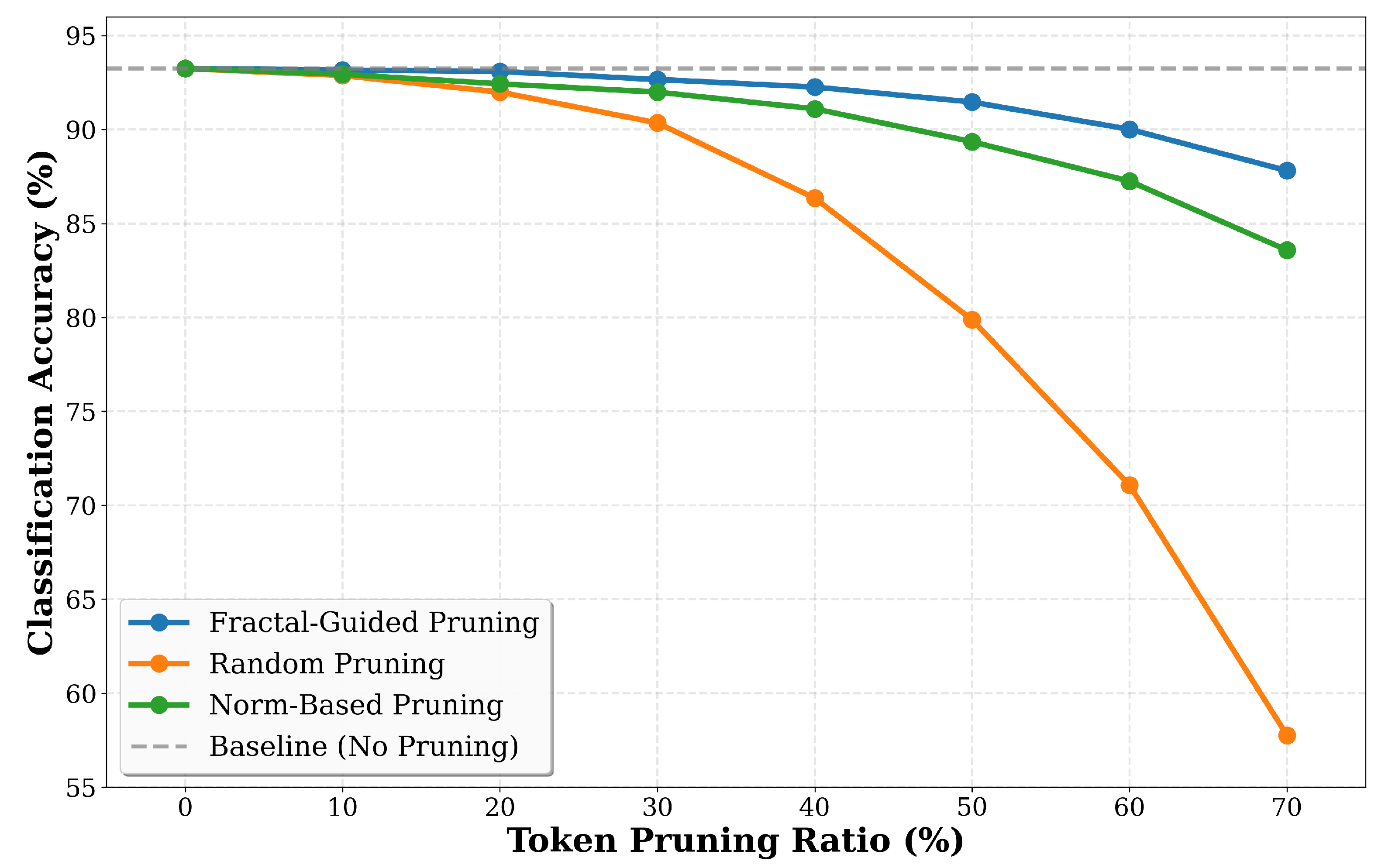 Figure 4 presents classification accuracy across pruning ratios ranging from zero percent to seventy percent on CIFAR-10. The results show that fractal-guided pruning maintains higher accuracy than random pruning and norm-based pruning across all tested configurations. At a 10% pruning ratio, fractal pruning achieves 93.16% accuracy compared to the 93.25% baseline, representing only a 0.09 percentage point drop, while random pruning achieves 92.87% accuracy with a 0.38 percentage point drop. At 20% pruning, fractal achieves 93.09% accuracy with a 0.16 percentage point drop, while random pruning degrades to 91.99% with a 1.26 percentage point drop. The performance gap increases at higher pruning ratios, with fractal achieving 92.26% accuracy at 40% pruning, representing a 0.99 percentage point drop from baseline, while random pruning suffers a 6.90 percentage point degradation to 86.35%. This 5.91 percentage point advantage at 40% pruning indicates that fractal dimension identifies and retains information-rich tokens that are important for maintaining classification performance.