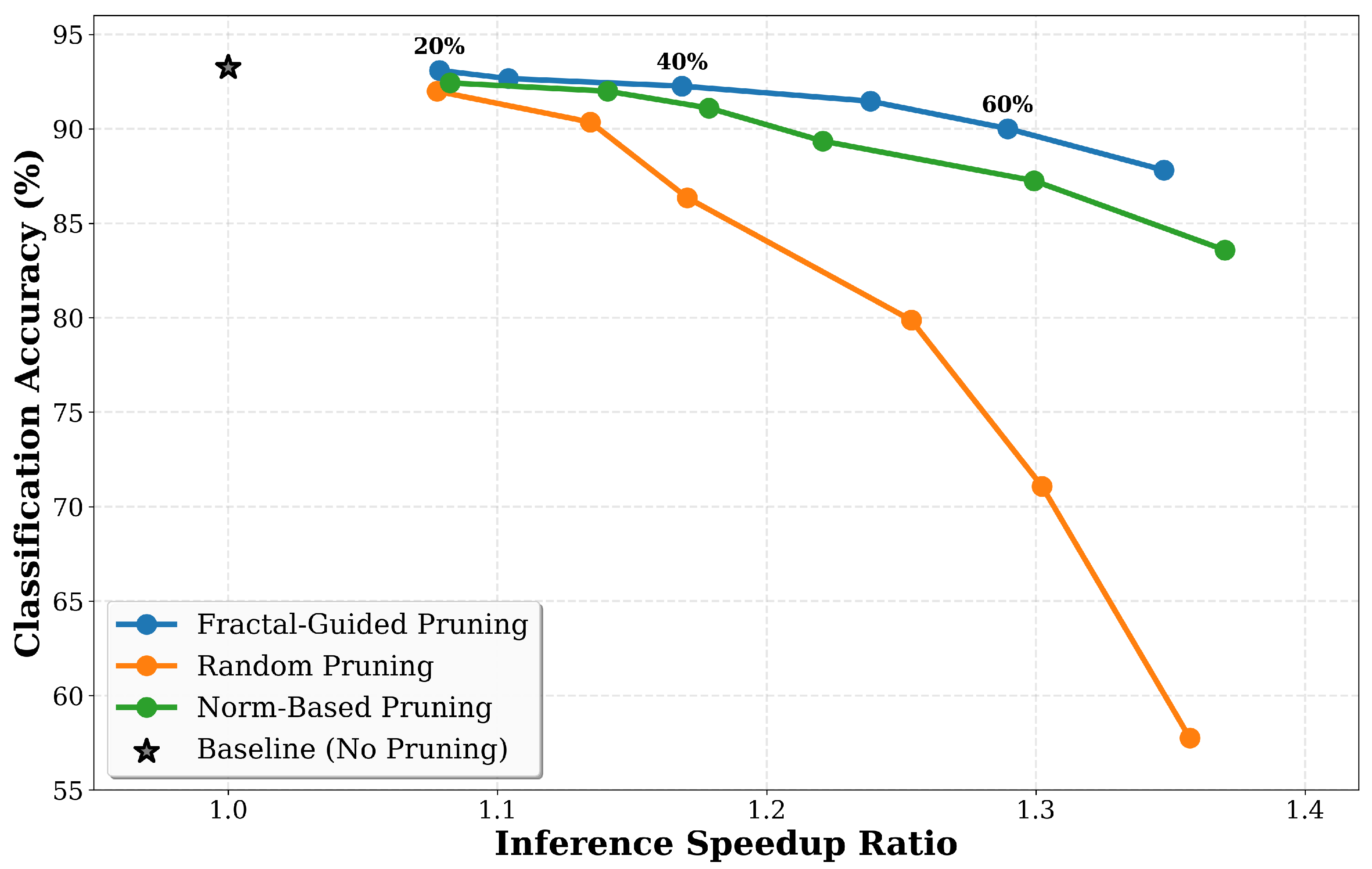 Figure 5 illustrates the Pareto frontier of accuracy versus inference speedup, showing that fractal pruning achieves better operating points compared to baseline methods. At 1.08× speedup corresponding to 20% pruning, fractal maintains 93.09% accuracy, while random achieves 91.99% accuracy. At 1.17× speedup for 40% pruning, fractal maintains 92.26% accuracy, while random achieves only 86.35% at similar speedup levels. At 1.29× speedup for 60% pruning, fractal achieves 90.01% accuracy compared to random’s 71.07% accuracy at equivalent speedup. These results show that fractal dimension captures token importance more effectively when computational constraints are stringent.