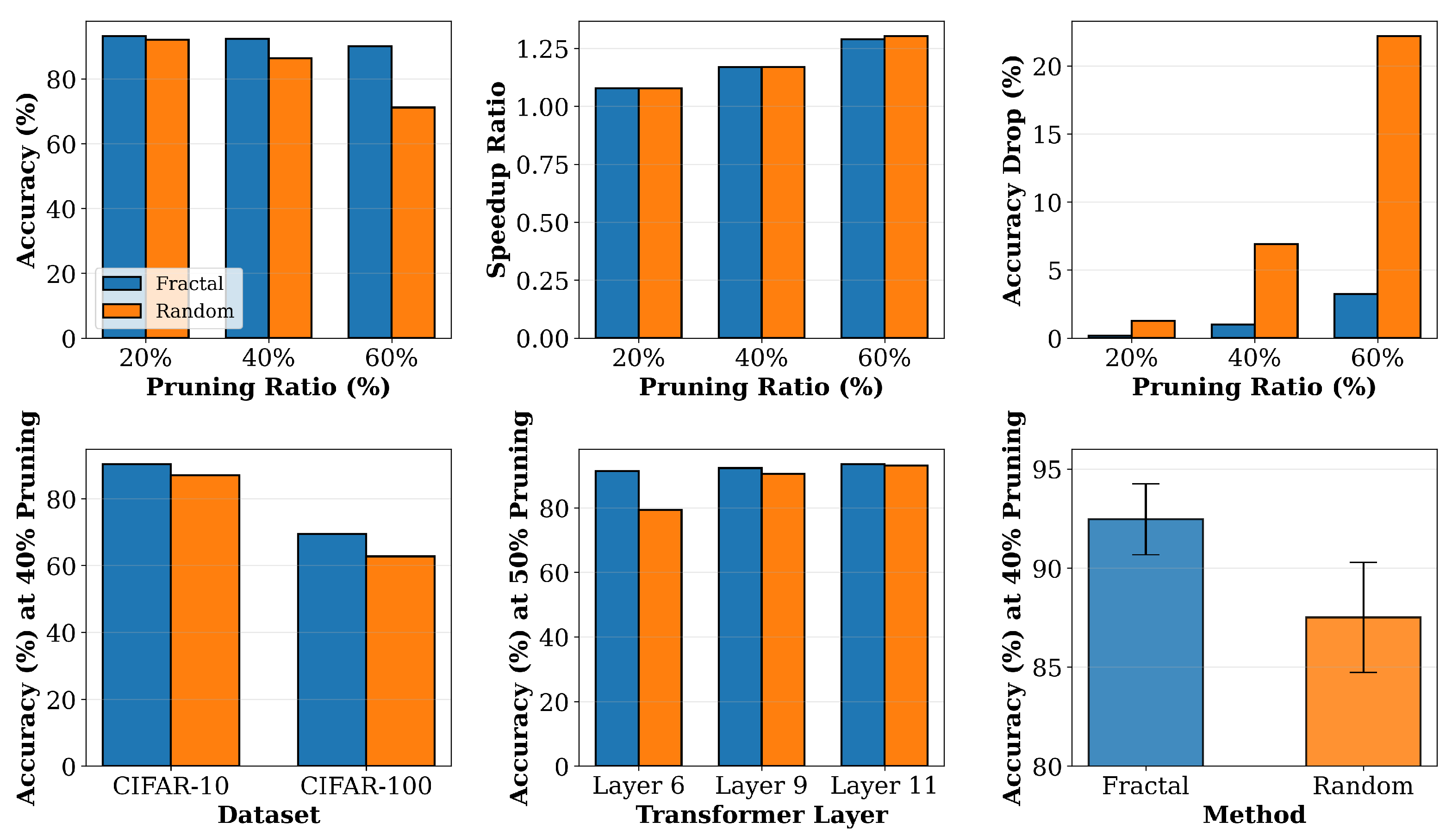 Figure 12 synthesizes results across multiple evaluation dimensions. The visualization shows performance across accuracy metrics, speedup ratios, accuracy degradation, cross-dataset generalization, layer-wise effectiveness, and statistical robustness. The top-left figure shows that fractal maintains higher accuracy than random at all tested pruning ratios of 20, 40, and 60%, with accuracies of 93.09%, 92.26%, and 90.01%, respectively, compared to random’s 91.99%, 86.35%, and 71.07%. The top-center figure confirms that both methods achieve similar speedup ratios of 1.08×, 1.17×, and 1.29× at the three pruning ratios, indicating that the accuracy advantage of fractal comes without additional computational cost. The top-right figure shows that fractal suffers minimal accuracy drops of 0.16, 0.99, and 3.24 percentage points at the three pruning ratios, while random suffers larger drops of 1.26, 6.90, and 22.18 percentage points, respectively. The bottom-left figure shows generalization across CIFAR-10 and CIFAR-100 at 40% pruning, with fractal achieving 90.29% and 69.45%, respectively, versus random’s 87.03% and 62.66%, representing advantages of 3.26 and 6.79 percentage points. The bottom-center figure shows layer-wise performance at 50% pruning across layers six, nine, and eleven, with fractal achieving 91.31%, 92.20%, and 93.43%, respectively, consistently outperforming random at all depths. The bottom-right figure presents statistical validation with error bars across multiple seeds, showing a fractal mean of 92.46% with standard deviation of 1.79% versus a random mean of 87.51% with standard deviation of 2.78%, confirming reliable superiority with lower variance. This analysis shows that fractal dimension provides a robust, generalizable measure of token importance across diverse evaluation criteria.