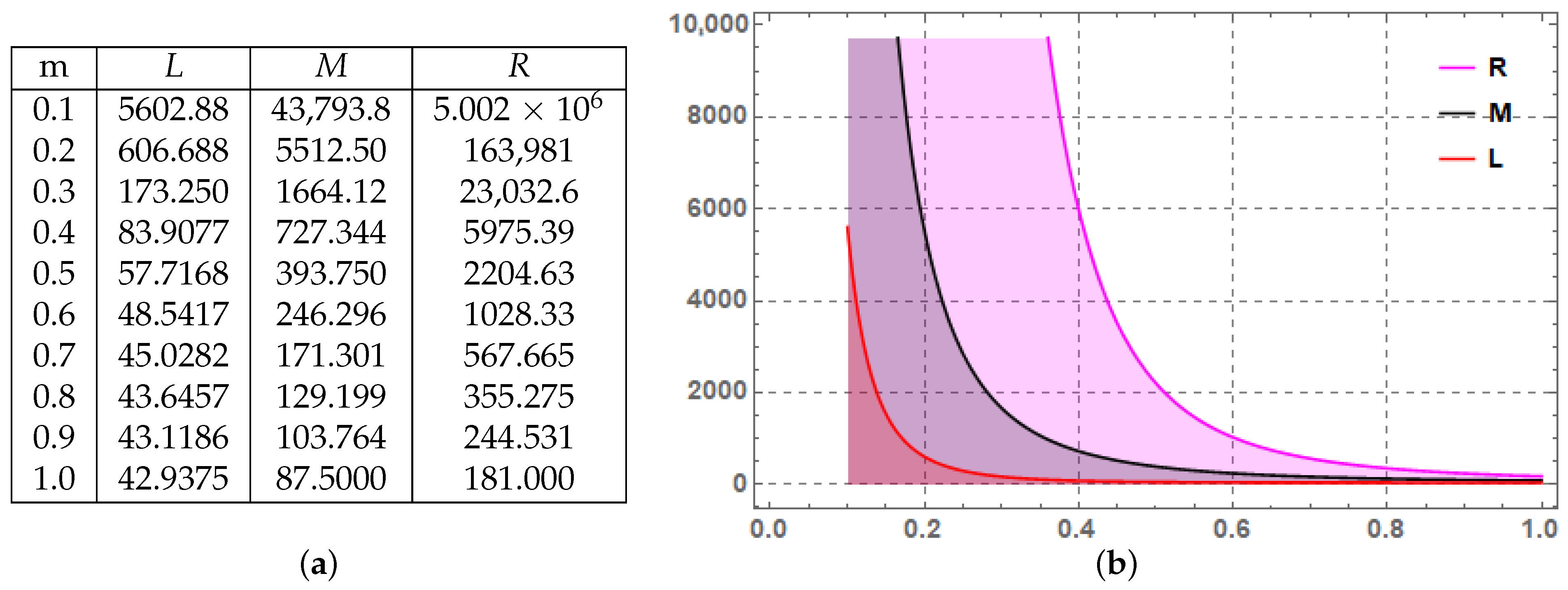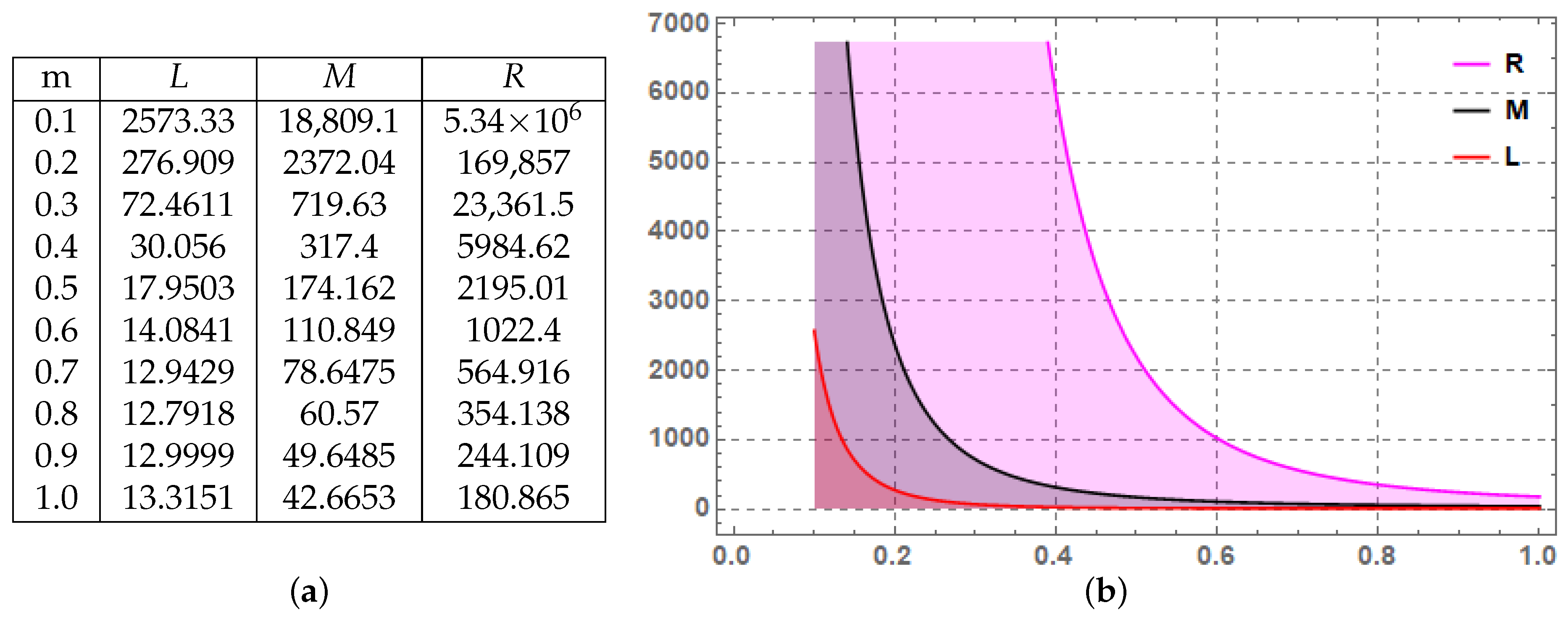 Figure 2. Graphical and numerical description of Ψ = y 3 via Theorem 9 for U o = 3 , V o = 4 and m ( 0.1 , 1.0 ) . (a) Numerical description of Theorem 9. (b) Graphical description of Theorem 9.