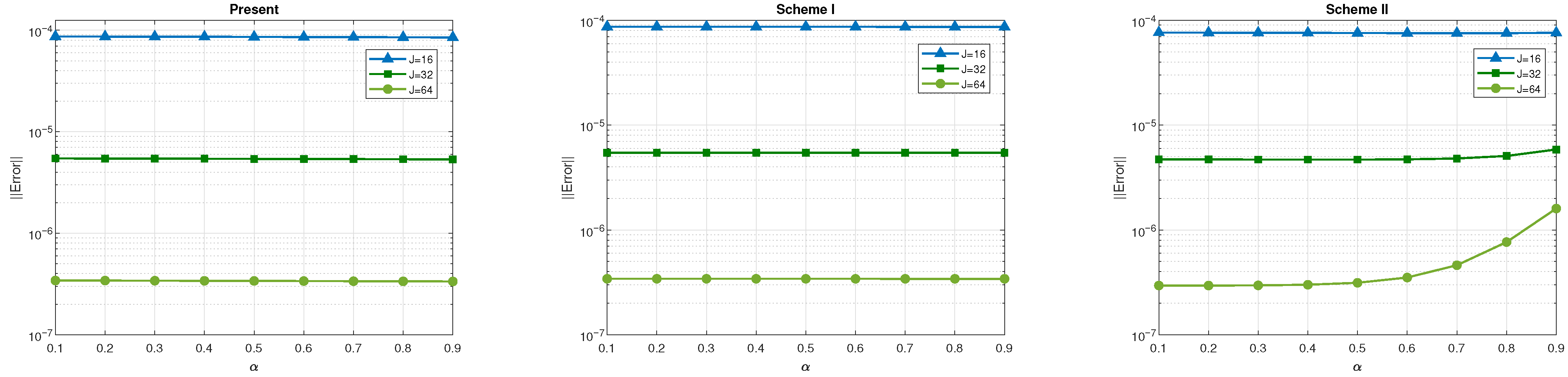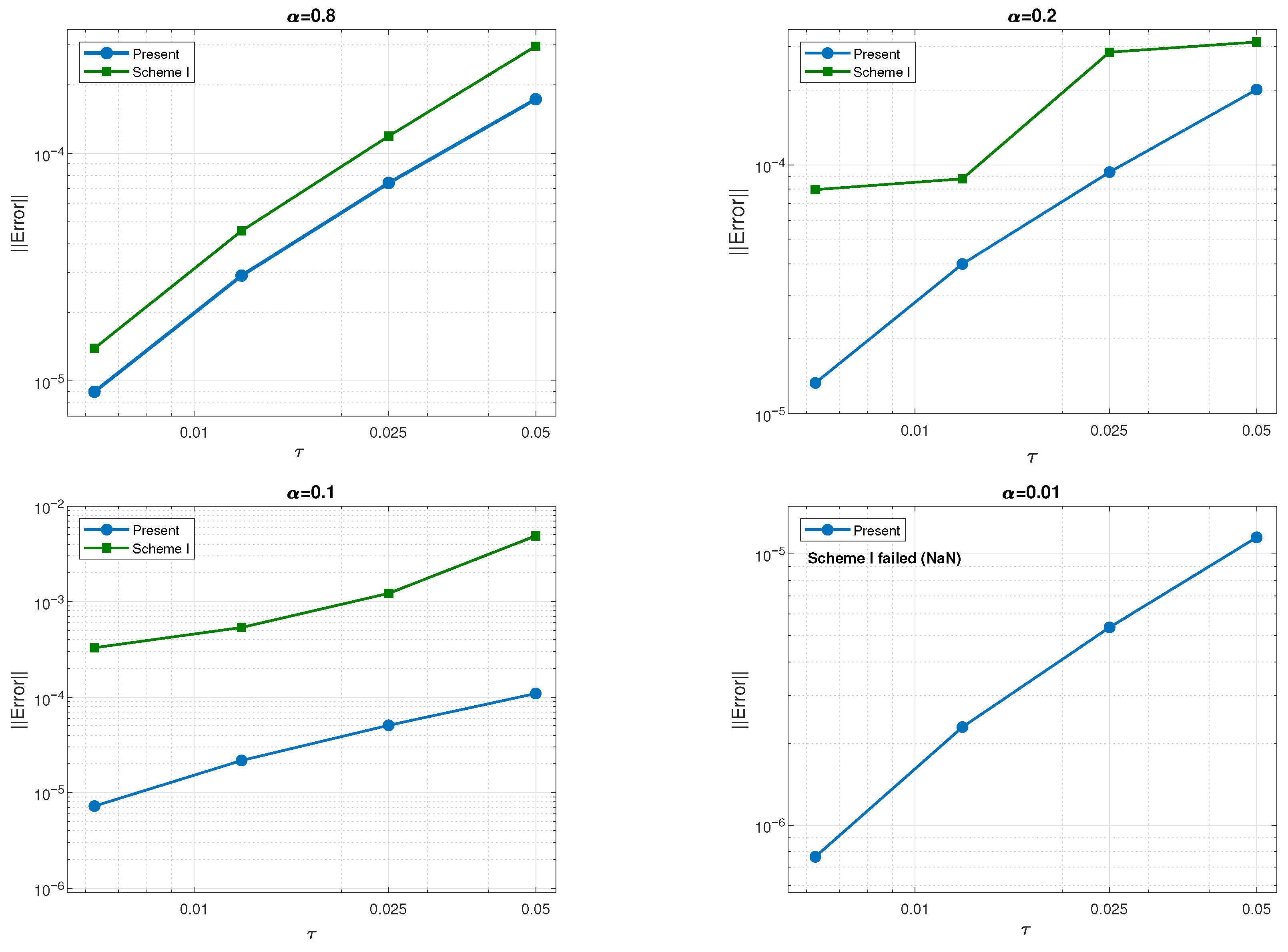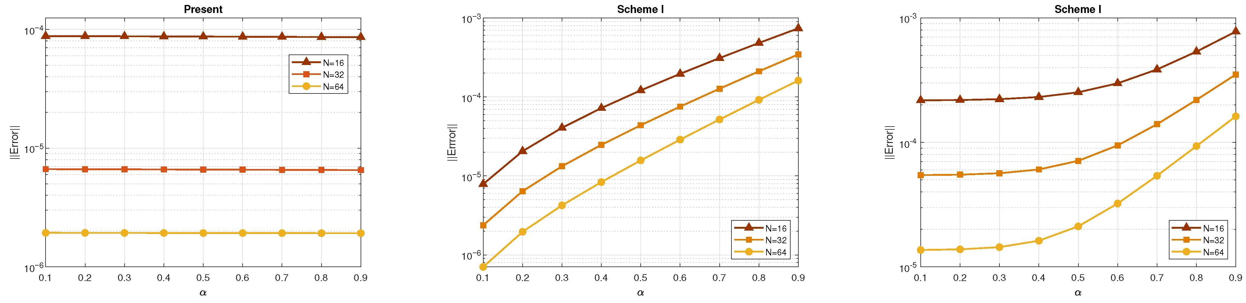 ), Scheme I suffers a clear loss of accuracy, while the present uniform-grid method remains stable and convergent. These results demonstrate that the proposed uniform discretization is a reliable alternative to graded meshes.