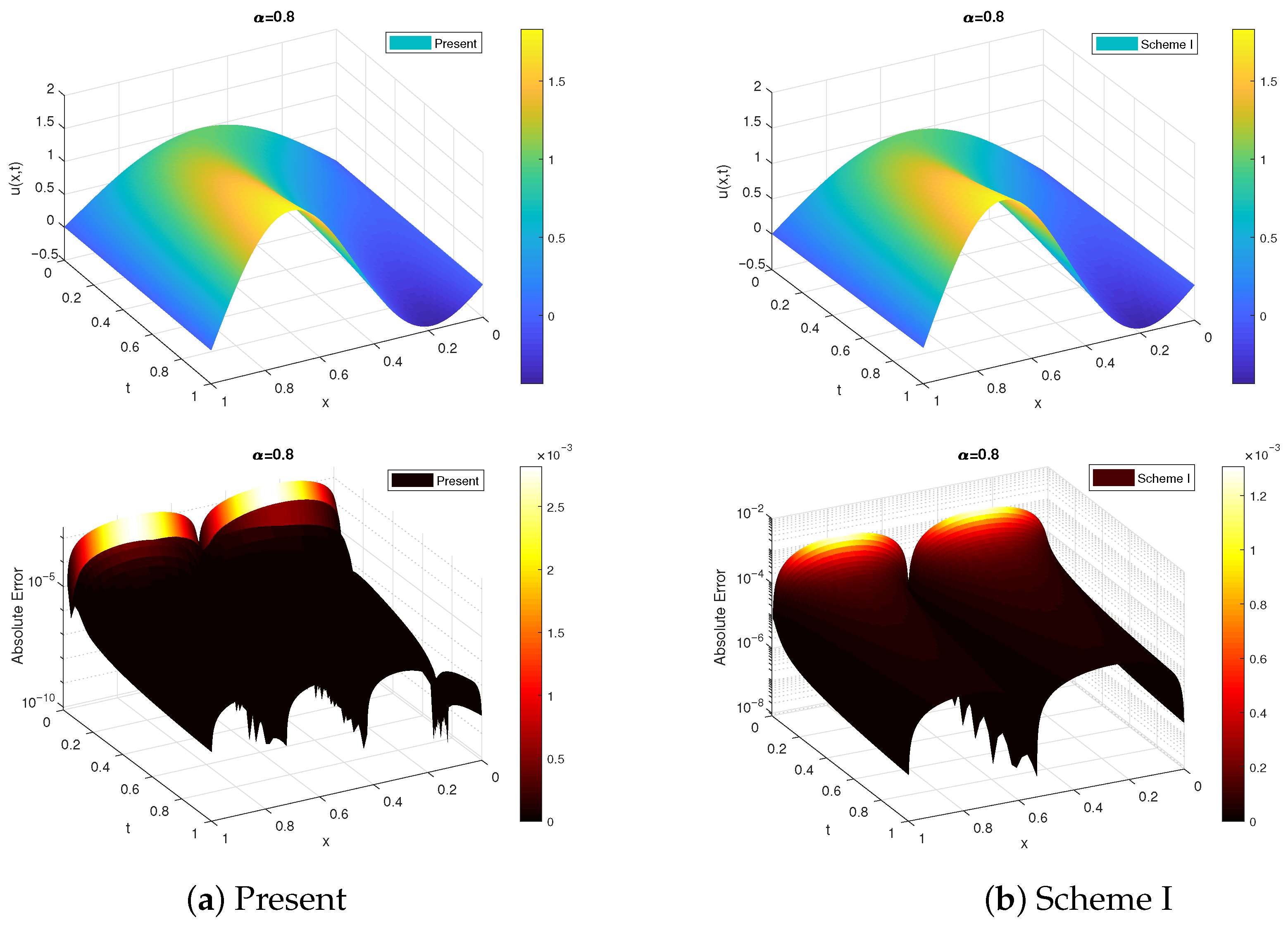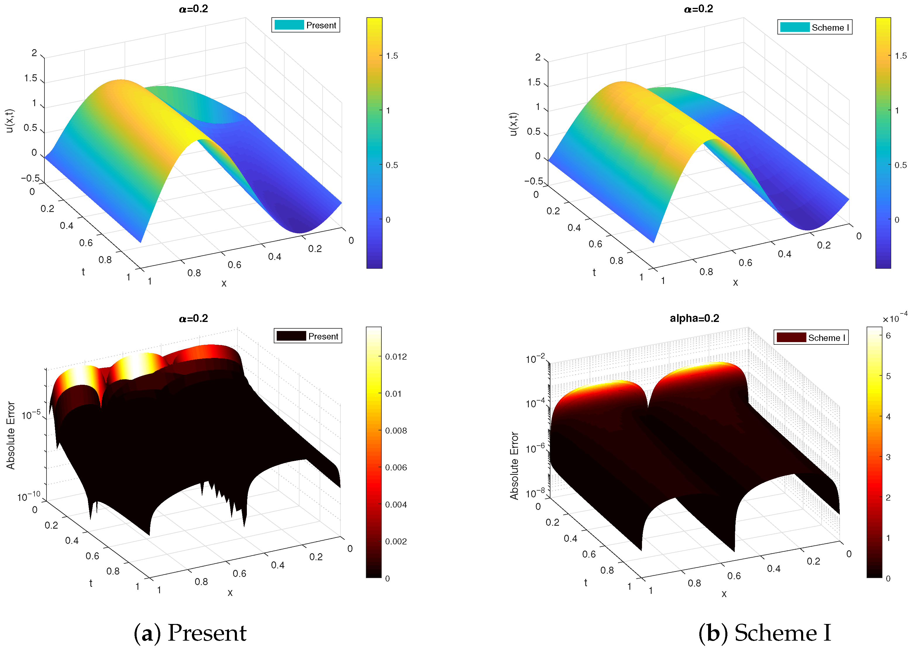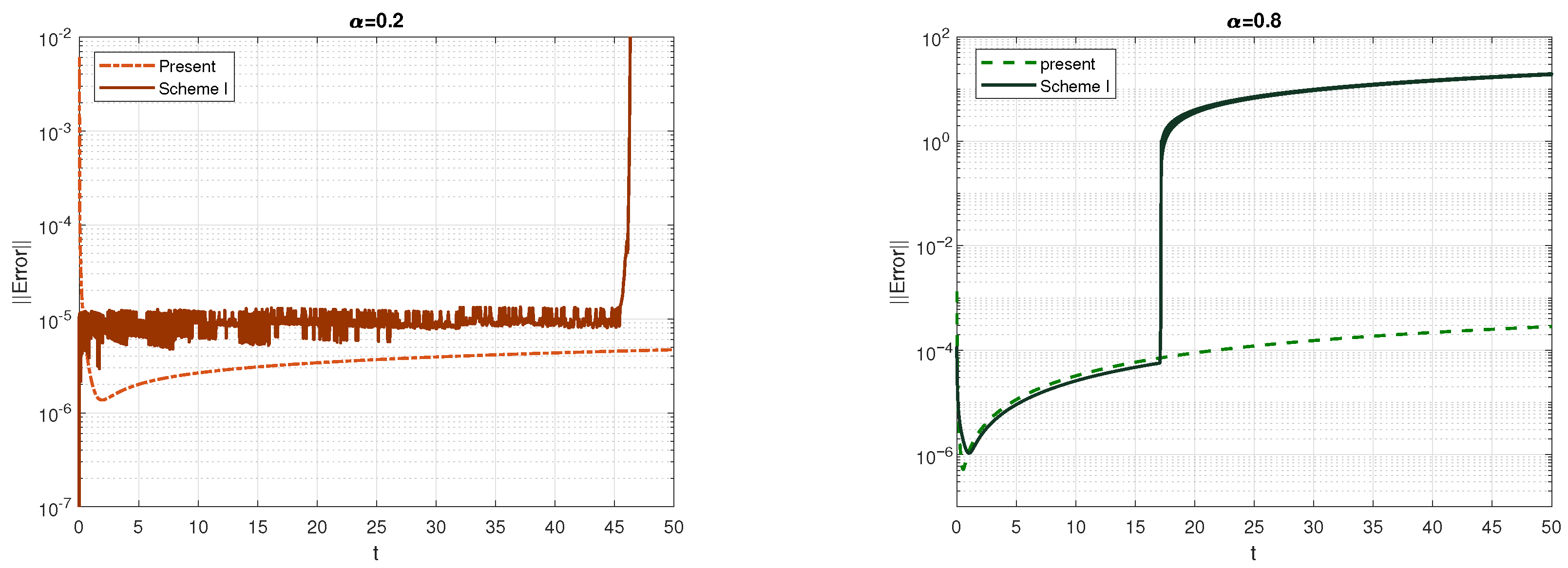 Figure 4 as representative examples where both schemes exhibit stable temporal accuracy, allowing a meaningful visual comparison of the error structures produced by the two methods. It can be observed that the distribution errors from Scheme I are smoother compared to those of the present scheme in both cases. This behavior corresponds to the nature of Scheme I, which utilizes non-uniform temporal meshes. Although our scheme is implemented on uniform meshes, it effectively captures the numerical solution at the final time, even though the errors are relatively higher around