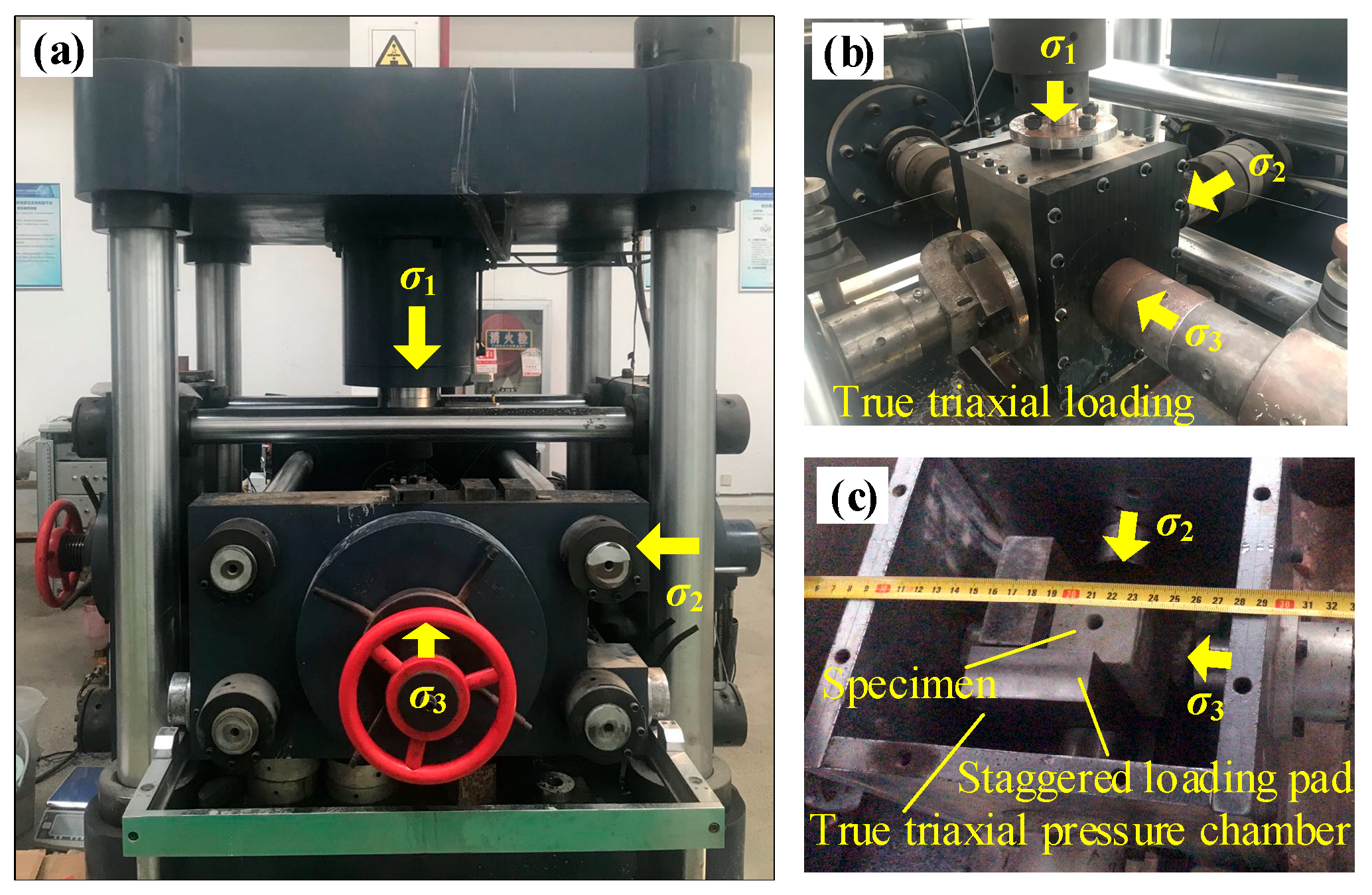 The tests were conducted using the true triaxial electro-hydraulic servo loading system at the State Key Laboratory of Intelligent Construction and Healthy Operation and Maintenance of Deep Underground Engineering, China University of Mining and Technology, as shown in Figure 2a. The testing apparatus primarily consists of a true triaxial electro-hydraulic servo loading control system and a true triaxial loading test platform, capable of accommodating cubic specimens with edge lengths up to 300 mm. The electro-hydraulic servo loading control system enables independent rigid loading control of σ1, σ2, and σ3 directions on coal–rock specimens. As illustrated in Figure 2b, the maximum loads that can be applied are 2000 kN in the σ1 direction, 500 kN in the σ2 direction, and 300 kN in the σ3 direction. The system achieves a stress loading accuracy of 0.01 kN and a displacement measurement accuracy of 0.002 mm.
