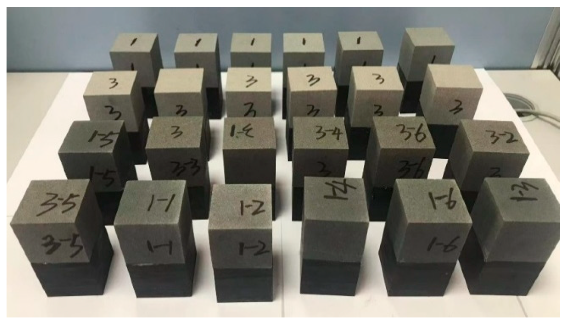 In the 3-1 coal seam, 33,301 return air entry of Guodian Construction & Investment Inner Mongolia Energy Co., Ltd., Ordos, China, large coal blocks (300 × 300 × 200 mm) were selected, and core specimens of the roof strata (75 mm) were drilled from the same region, obtaining coarse sandstone directly above the roadway. The coal–rock specimens were cut and drilled along vertical bedding planes in the laboratory and processed into cubic specimens measuring 50 × 50 × 50 mm. Coal–rock composite specimens were bonded using epoxy resin, with end faces perpendicular to the specimen axis (angular deviation within 0.001 radians) and non-parallelism not exceeding 0.02 mm, as shown in Figure 4. It should be noted that epoxy resin is stronger than natural coal–rock interfaces, which may reduce interface slip and slightly enhance composite stiffness. This limitation will be addressed in future studies.