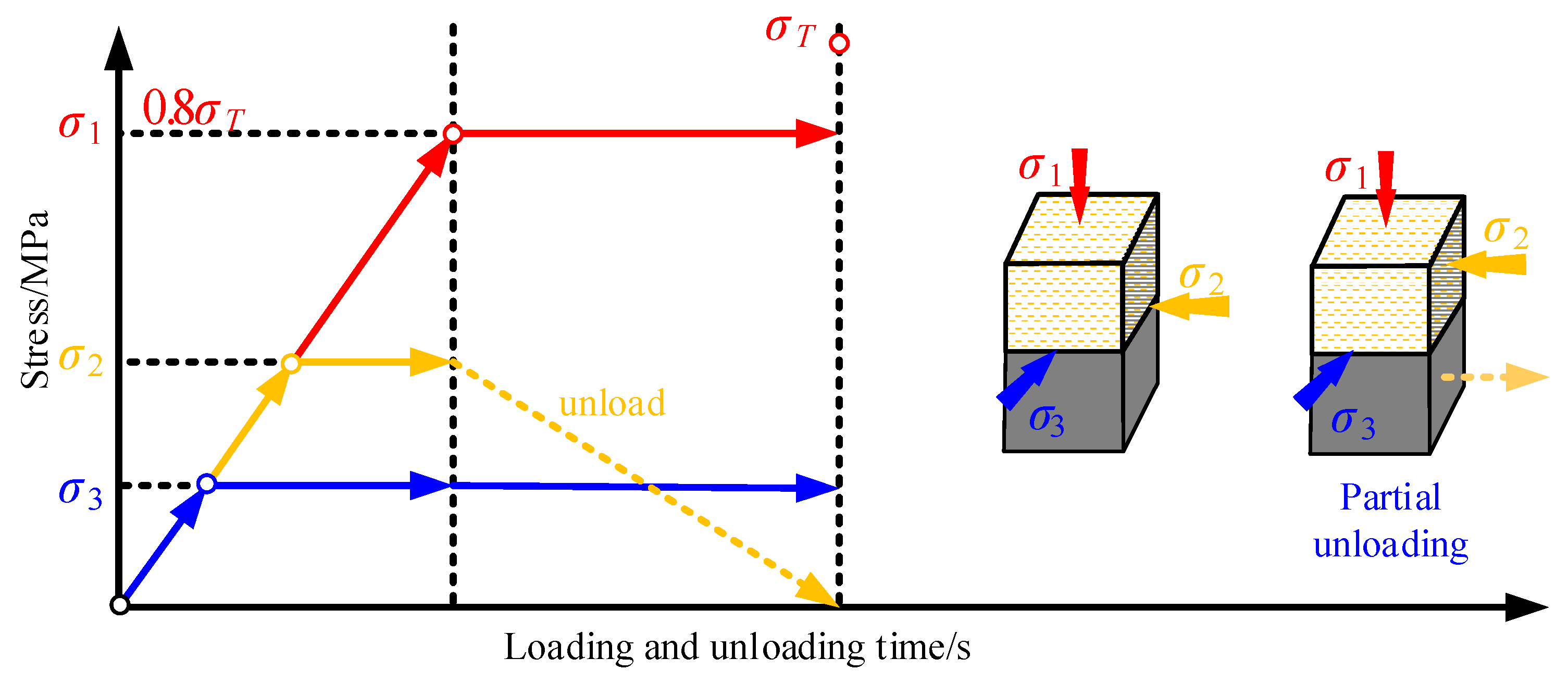 Based on the stress model of the coal–rock composite, a confining pressure level was applied to investigate the mechanical behavior of the composite specimens under true triaxial compression. The effects of different water content conditions on the unloading and failure characteristics of coal within the composite were comparatively analyzed. Combined with the in situ stress measurement results from the study area, the true triaxial loading–unloading path used in this experiment is shown in Figure 5.