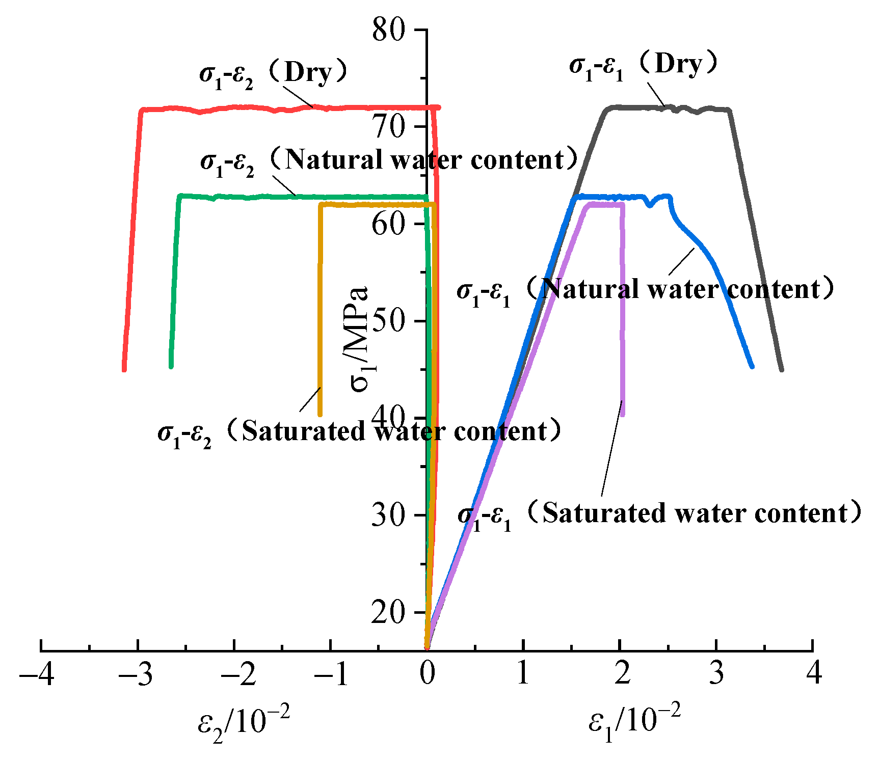 Figure 6 shows the axial (σ1) and lateral (σ2) stress–strain curves of the coal–rock composite specimens under the constant axial stress with decreasing confining pressure path. As shown, after the confining pressures σ2 and σ3 reached the set values of 15 MPa and 10 MPa, respectively, both axial compression and circumferential compression increased linearly with the increment of axial stress. The lateral (σ2) compressive deformation during this stage is mainly due to lateral expansion of the composite specimen along the minimum principal stress direction (σ3) under axial loading, which further compresses the specimen in the σ2 direction to maintain constant stress in that direction.