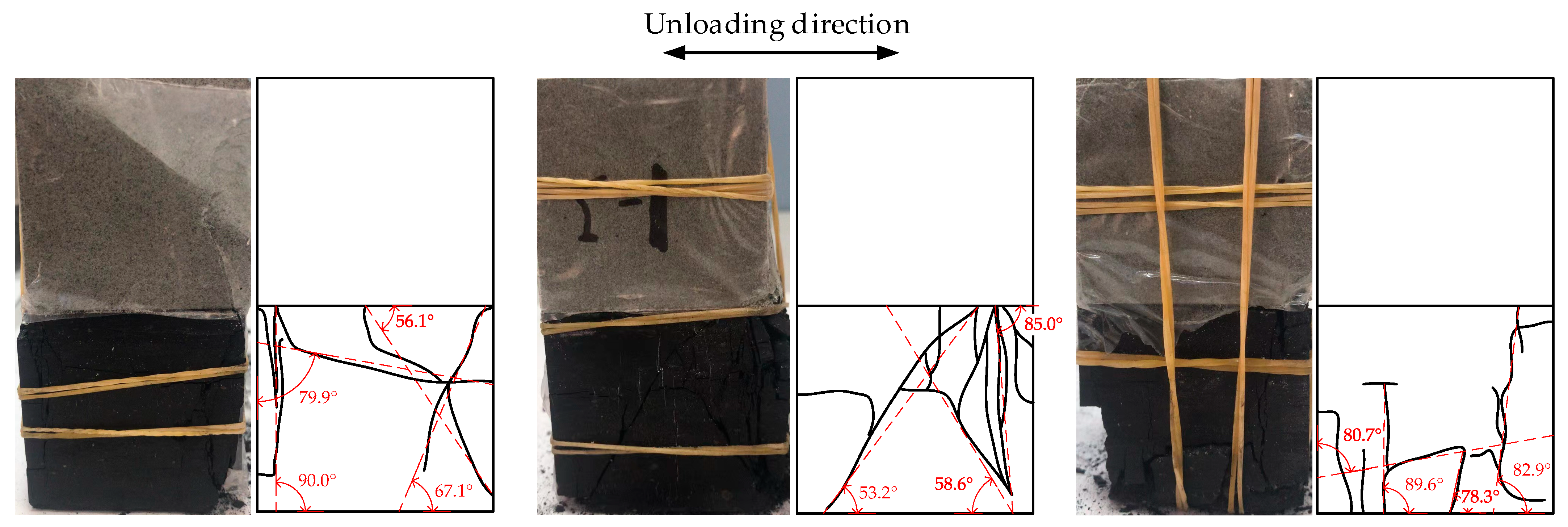 The water content of the rock significantly influenced the failure mode of coal within the composite. In addition to mechanical weakening, water-induced clay swelling softens cleat surfaces and promotes microcrack initiation, contributing to accelerated fracture development under local unloading. For example, in coarse sandstone–coal composite specimens: