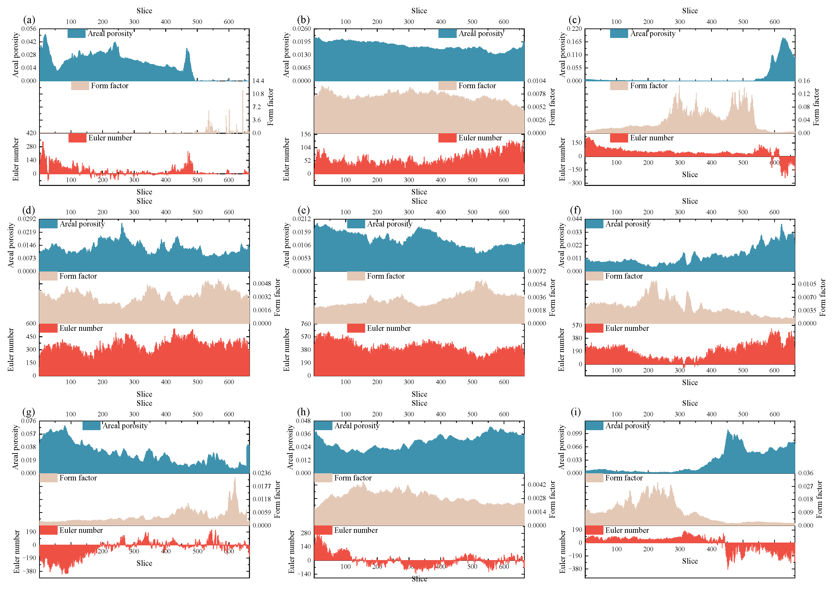 Areal porosity is defined as the ratio of the pore area to the total area in a slice, reflecting the degree of local pore development. The Euler number is a topological parameter that characterizes the connectivity of the pore structure: a positive value indicates that pore-like structures dominate with poor connectivity, while a negative value indicates that network-like structures dominate with good connectivity. The form factor describes the complexity of the pore shapes, with values close to 1 indicating regular (approximately circular) shapes, and values close to 0 indicating highly irregular and complex shapes.