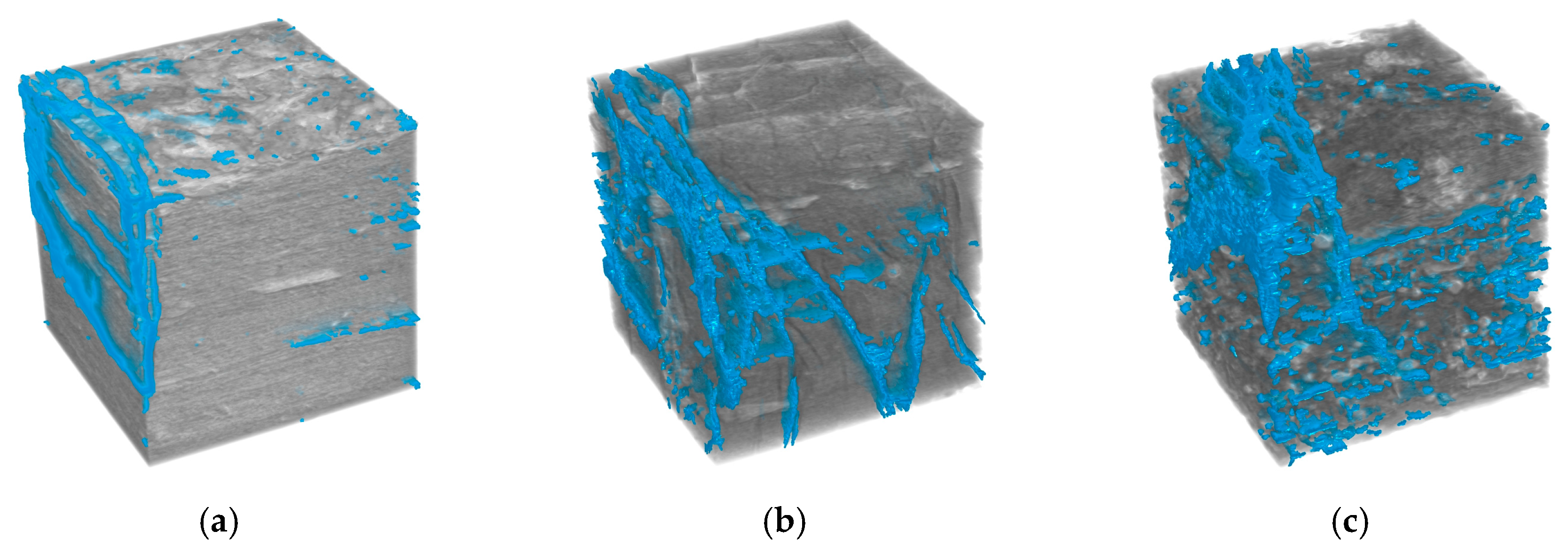CT scanning is an X-ray computed tomography (CT) technique, widely used for physical structure analysis. An X-ray source emits radiation, which scans the material placed on a mechanically controlled stage [36,37,38]. After penetrating the material, the X-rays are attenuated and detected by a detector, and the signals are fed back to a computer for analysis [39]. The X-ray intensity is fixed, and the feedback signals are converted into digital signals. The computer calculates the value of each pixel based on the measured attenuation coefficients and determines the grayscale for each point in the image. These values are then reconstructed into an image, revealing the internal structure of the material. Through computer signal processing and differences in X-ray attenuation of various materials, the scanned images can be automatically obtained. In this experiment, the Zeiss Xradia 510 Versa system was used. The scanning pixel size was 52.7666 μm, and the image dimensions were 1004 × 1024 pixels.