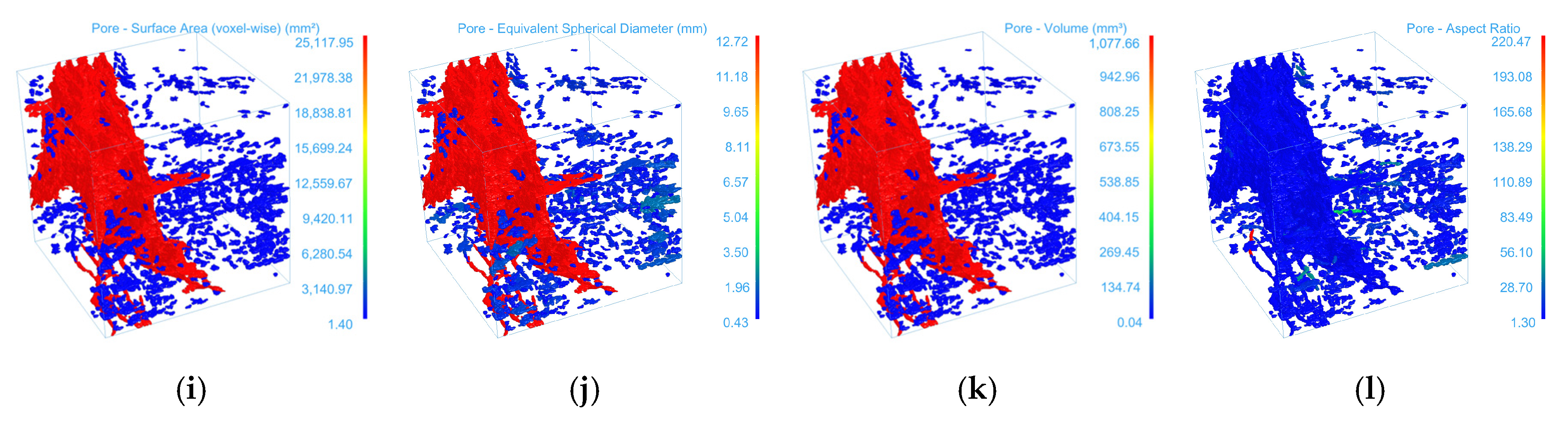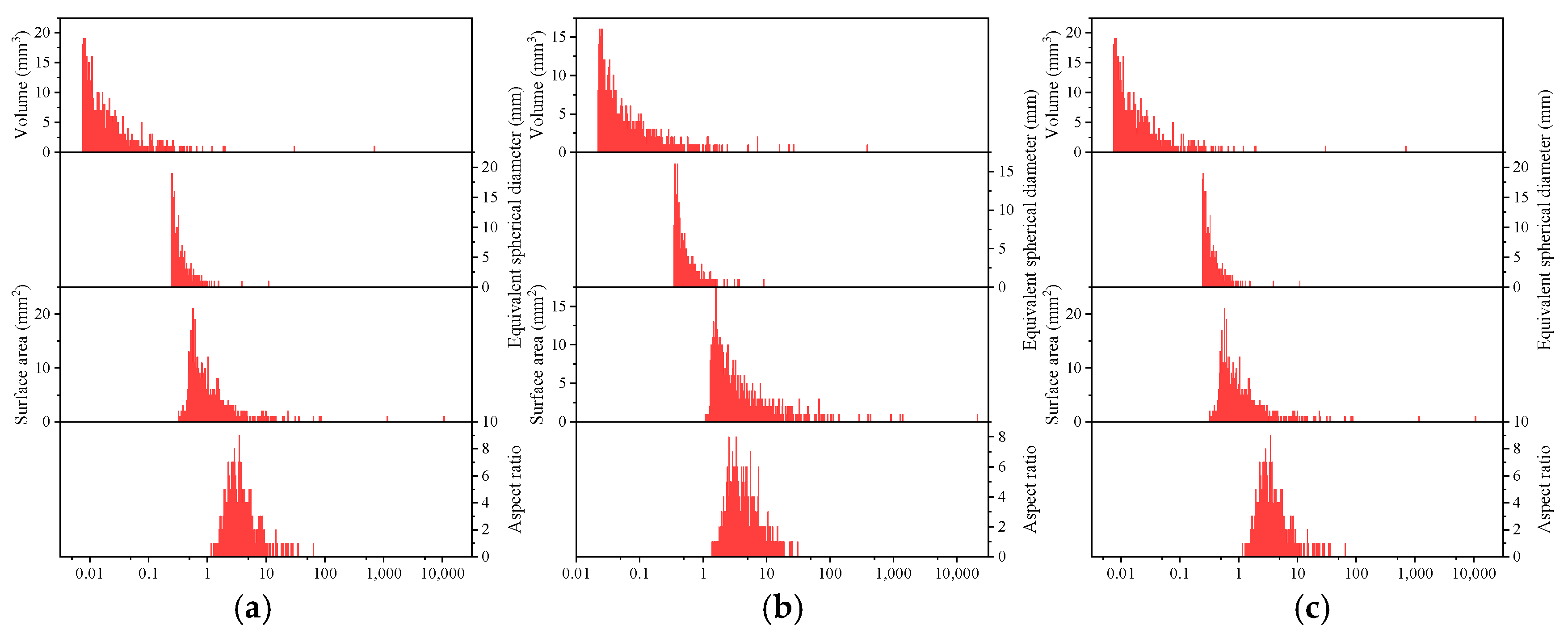 Figure 11 presents the histograms of volume, surface area, equivalent spherical diameter, and aspect ratio for different specimens. Considering that the polarization phenomenon is not well represented in linear scale, a logarithmic transformation was applied to the X-axis, and the frequency intervals were reduced. The Y-axis represents the frequency.