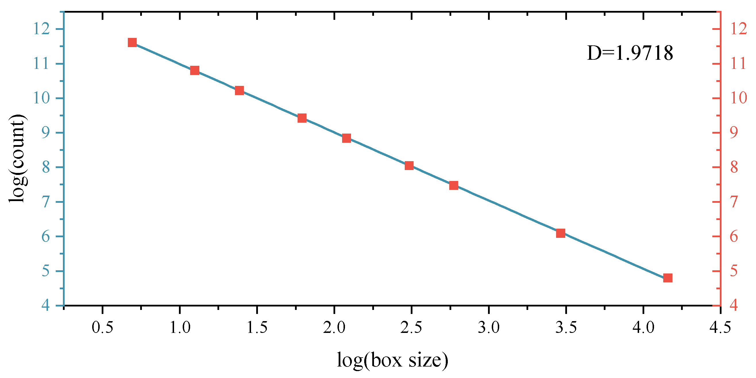 In two-dimensional CT images (e.g., coal fracture slices), the fractal dimension D describes the complexity of fracture contours or the area occupied by fractures across different scales [40,41,42]. The most commonly used measurement method is the box-counting method [43,44], which involves the following steps: