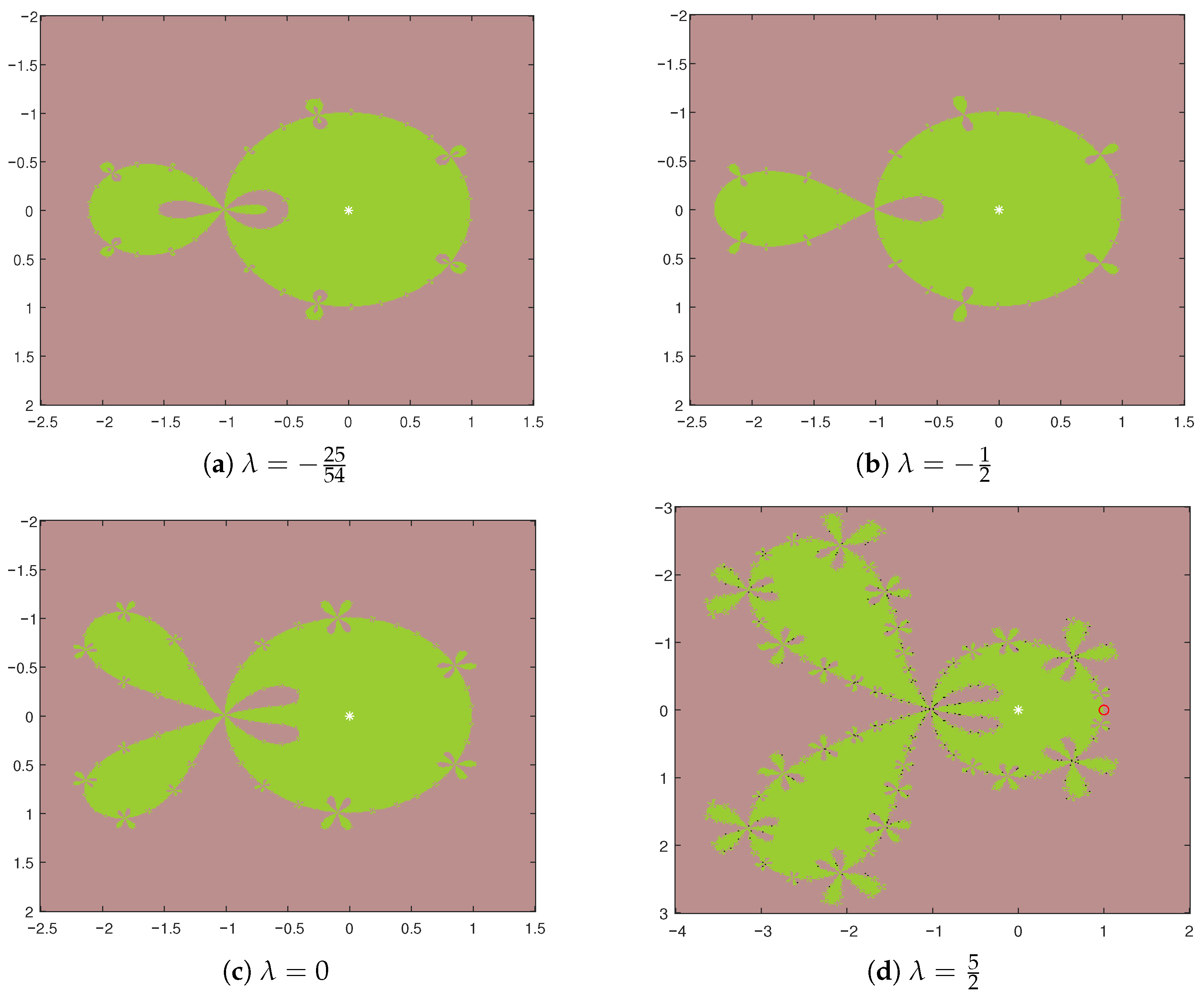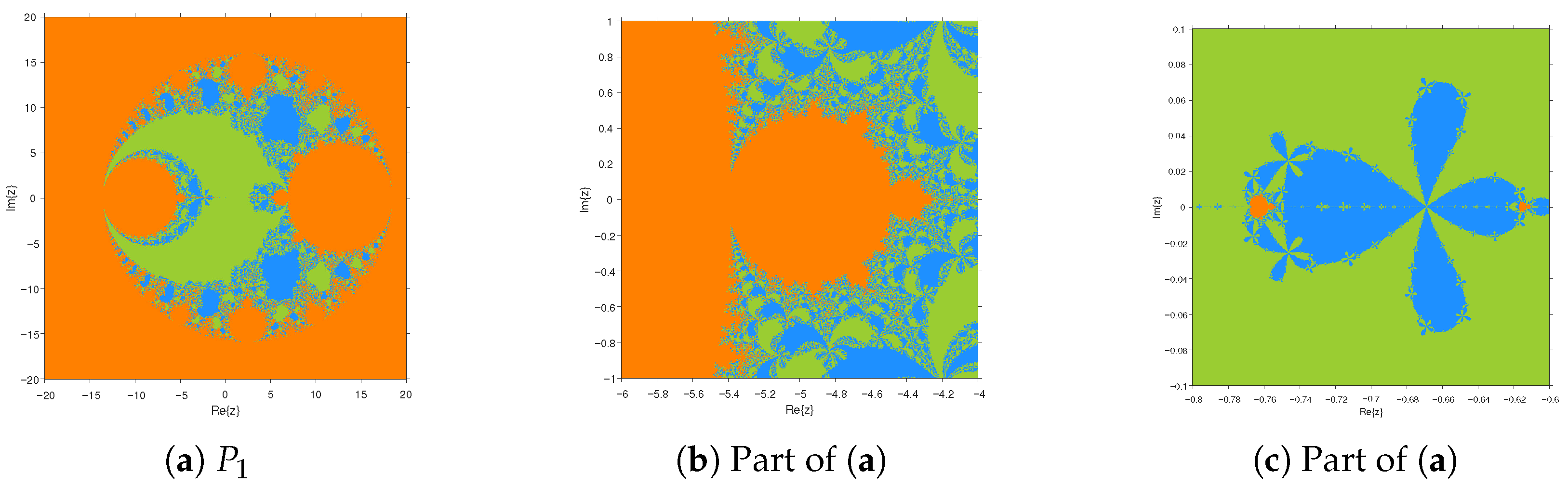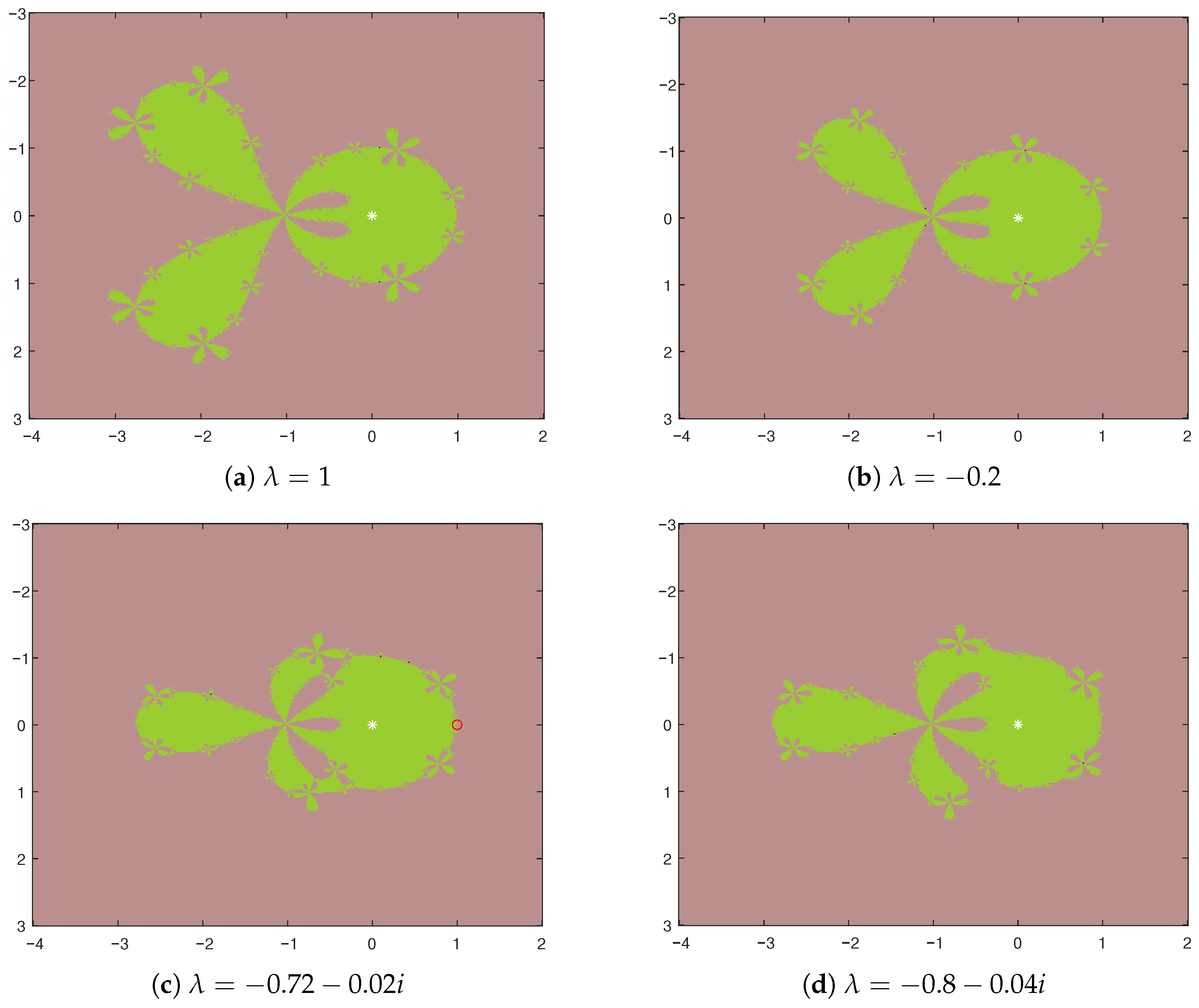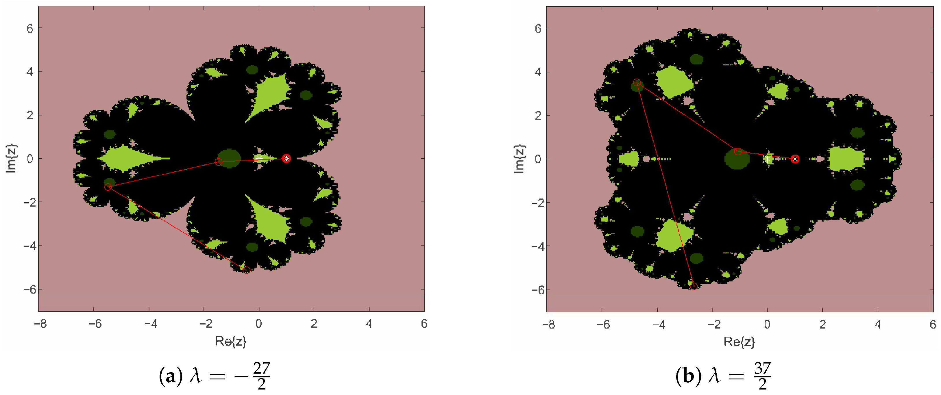 - Lee, M.Y.; Kim, Y.I. The dynamical analysis of a uniparametric family of three-point optimal eighth-order multiple-root finders under the Möbius conjugacy map on the Riemann sphere. Numer. Algorithms 2020, 83, 1063–1090. [Google Scholar] [CrossRef]