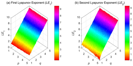 Although this approach constitutes a numerical approximation by neglecting the infinite memory tail, it provides a robust qualitative indication of the system’s sensitivity to initial conditions, grounded in the actual dynamical trajectory. Following this standard methodology, we estimated the two LEs ( and ) across a 2D parameter space where p and q vary from 1 to 5. The resulting LE distributions are shown in Figure 1a,b.