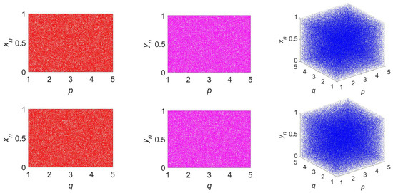 In nonlinear dynamics, bifurcation analysis serves as a cornerstone for characterizing system behavior under parameter variation [9]. It involves iteratively computing asymptotic states and plotting them against one or more control parameters to identify parameter regimes associated with fixed points, periodic orbits, or chaos. Figure 2 illustrates the bifurcation characteristics of our 2D-VFCQHM. It includes two sets of 2D bifurcation plots: one varying while fixing , and the other varying with held constant, complemented by 3D bifurcation plots that capture the system’s dynamics when both p and q are simultaneously swept across their respective ranges. A close inspection of these diagrams reveals that the 2D-VFCQHM consistently displays robust chaotic dynamics throughout the entire parameter domain, as evidenced by the dense, uniformly distributed state points across the unit interval. This behavior is quantitatively confirmed to be hyperchaotic by the two positive LEs analyzed in Section 2.4. Such persistent and widespread chaos underscores the map’s strong ergodicity and sensitivity to initial conditions. These are properties that make it especially suitable for cryptographic applications, notably in the field of image encryption.