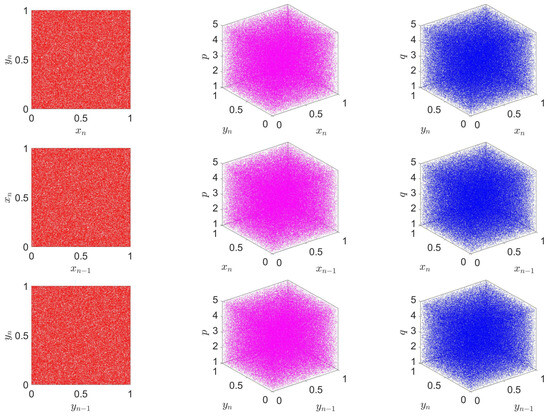 To further investigate the dynamical behavior of our 2D-VFCQHM, we present a comprehensive set of trajectory diagrams in Figure 3. These include 2D phase portraits and return maps under fixed system parameters, as well as 3D trajectory evolutions when one of the control parameters is varied. Specifically, the first column displays the classical 2D phase portrait and two return maps ( and ), all computed with , . The second and third columns illustrate the 3D trajectories, respectively, where p and q vary over the interval . The observed trajectories exhibit dense and uniformly distributed patterns across the state space, with no discernible periodic structures or convergence to fixed points. This uniform coverage indicates strong ergodicity and high sensitivity to initial conditions, which are hallmark characteristics of hyperchaotic systems. Notably, the 3D plots reveal intricate spatial dynamics that evolve continuously with changes in the parameters, confirming the system’s complex dynamical structure. This behavior highlights the 2D-VFCQHM’s strong potential as a robust random sequence generator, especially for chaos-driven applications like image encryption.