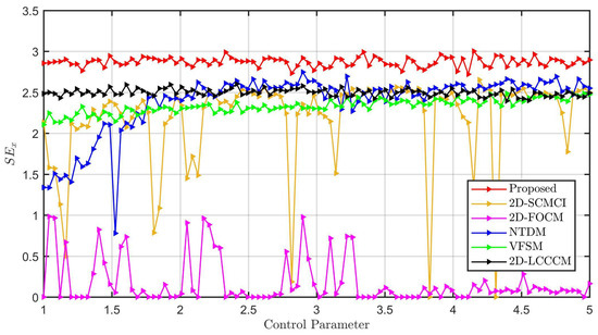 For a fair comparison, the ranges of variable control parameters for all maps are kept consistent. We specifically selected benchmark maps that possess a primary control parameter capable of supporting the common numerical range of . This compatibility eliminates the need for parameter normalization or scaling. Specifically, we varied parameter a for VFSM, NTDM, and 2D-SCMCI, and parameter for 2D-FOCM and 2D-LCCCM. All other system parameters were fixed at the preferred values reported in their respective literature [4,5,44,50,51]. For the proposed 2D-VFCQHM, the parameter p is varied within (with ). The resolution for all parameter sweeps is set to 100 points. The system is first iterated for 1000 steps to eliminate transient effects. Then, a sequence of 2000 points is generated for analysis. The adopted SE calculation parameters are embedding dimension , time delay , and tolerance radius , where std is the standard deviation of the generated sequence.