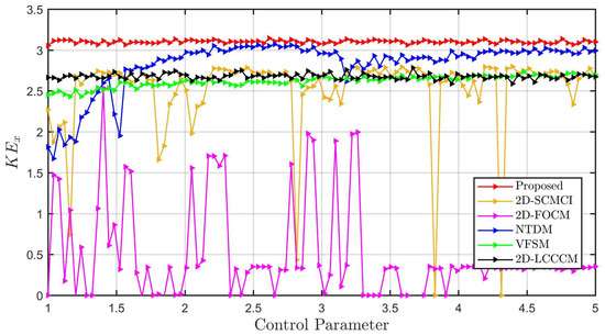 Figure 5 presents the corresponding results. Like the SE analysis, the 2D-VFCQHM consistently achieves the highest and most stable KE values. In contrast, the conventional integer-order and constant fractional-order benchmarks exhibit significant fluctuations and frequent transitions into periodic regimes (near-zero KE values). These results further support the SE analysis, reinforcing that the state-dependent variable-order mechanism confers superior hyperchaotic complexity compared to both constant-order and integer-order counterparts.
