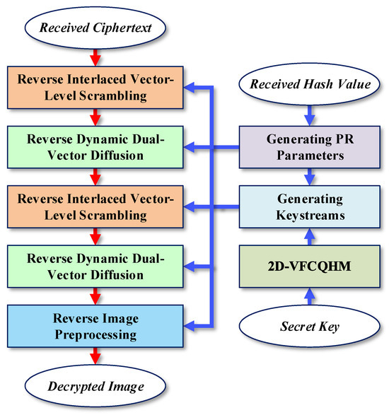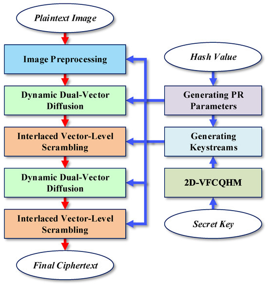 Leveraging the exceptional hyperchaotic properties of the 2D-VFCQHM, we have further devised an efficient image encryption algorithm termed IEA-VMFD, aiming to provide robust protection for image data. Our IEA-VMFD comprises a series of meticulously crafted encryption steps: generating plaintext-related parameters, generating keystreams, image preprocessing, dynamic dual-vector diffusion, and interlaced vector-level scrambling. As depicted in Figure 6, dynamic dual-vector diffusion and interlaced vector-level scrambling will be executed twice, resulting in a novel diffusion-scrambling mechanism that deviates from common permutation-diffusion designs.