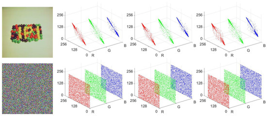 The independence of the encryption process from the plaintext is a critical vulnerability that makes numerous recent algorithms susceptible to cryptanalysis [38,41]. To address this, our proposed IEA-VMFD algorithm incorporates plaintext-related parameters into the encryption process to enhance its resilience against plaintext attacks. For the input pixel matrix , derived from one color image or three grayscale images, its plaintext-related parameters can be produced as follows: