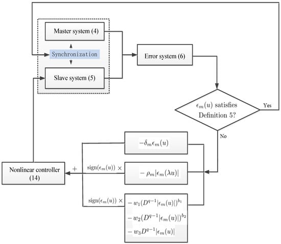 Figure 1 gives the nonlinear control block diagram between primary–secondary systems (4) and (5). Our goal is to apply external nonlinear control to the secondary system so that the error between the primary–secondary systems satisfies Definition 5. The nonlinear controller (14) consists of three key functional modules, which have different functions and roles. The first part expands the selectable range of system parameters. The second part eliminates the impact of proportional delay on system stability. The last part , , and ensures that systems converge within a fixed time frame regardless of initial conditions, as can be clearly seen from the settling time estimation formula.