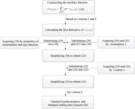 This article proves the fixed-time synchronization of PDHNNs by the comparison theorem and Lyapunov function method. As shown in Figure 2, we give a proof schematic diagram of Theorem 1, which demonstrates the logical deduction between mathematical relationships (16)–(26). First, select the auxiliary function with -order derivative () and calculate the first derivative of . Second, acquire (19) by properties of uncertainties and the sign function, and acquire (20) and (21) by Assumption 1. Based on (19)–(21), simplify (18) to obtain (22). Third, by Lemmas 2 and 3, one can get (25) and (26) and finish the proof.