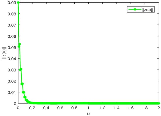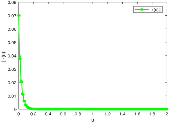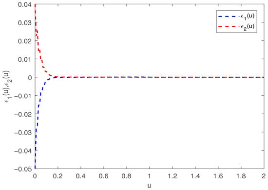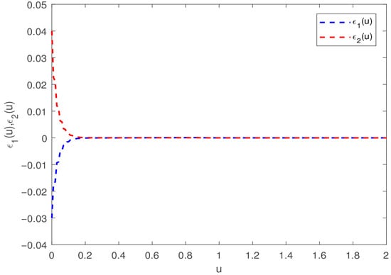 It is clear that the above parameter values satisfy the conditions in Theorem 1. According to calculation Formula (15), the settling time can be estimated as 1.7285 s. The initial conditions are chosen as . Under the above control parameters, the error evolution of each neuron over time is shown in Figure 3. The blue and red dashed lines represent the error states of the first and second neurons, respectively. The evolution of the error norm over time can be seen in Figure 4. From Figure 3 and Figure 4, it is evident that the errors of primary–secondary systems (30) and (31) converge to zero within the specified time, indicating that the network achieves synchronization within a fixed time.