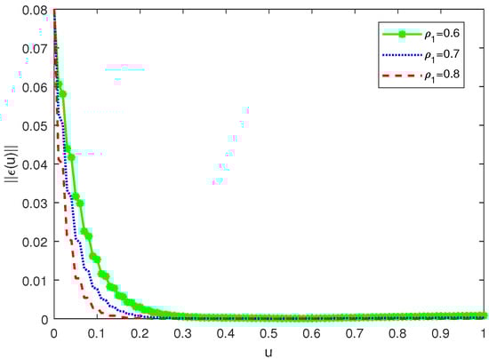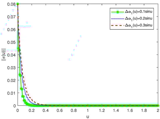 To assess the impact of parameter changes on synchronization capability, we focus on studying the uncertainties and the strength of feedback control. To simultaneously evaluate the robustness of our controller, initial values were randomly selected from the range of . Two types of experiments use different initial values, and experiments of the same type use the same initial values to ensure experimental fairness. The coefficients of parameter uncertainties are selected as 0.1, 0.2, and 0.3, respectively. As shown in Figure 5, the larger the coefficient, the longer the time spent for the system to achieve synchronization. In addition, we adjust the control strength under the same initial conditions and observe its impact on system synchronization. Figure 6 shows that as the control strength increases, the time for the primary–secondary networks to achieve synchronization gradually decreases. The above experiments indicate that our control method is not limited by the changes of initial conditions and parameters. As long as the parameters satisfy the conditions of Theorem 1, the fixed-time synchronization task of fractional PDHNNs can be completed.
