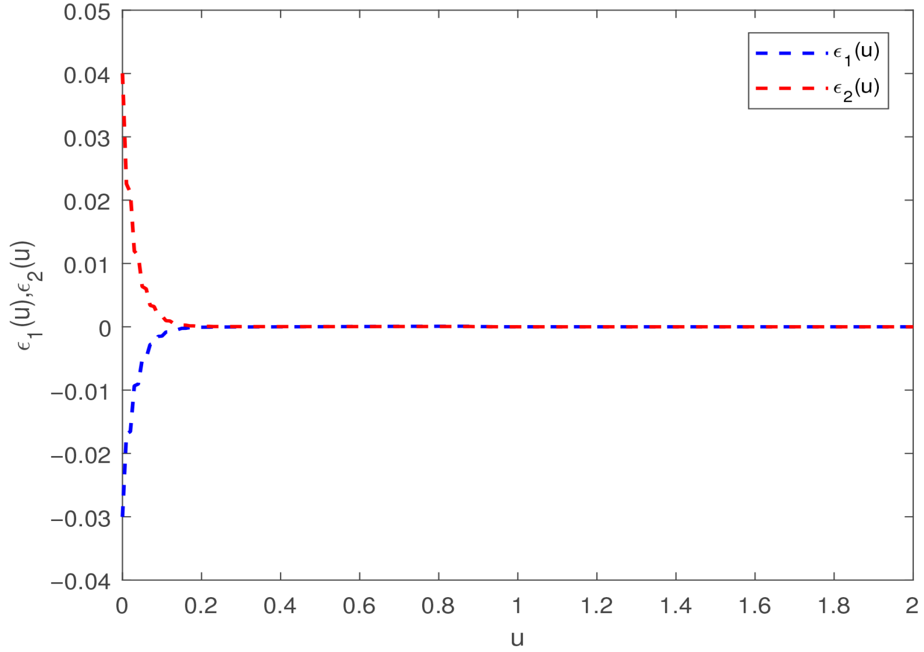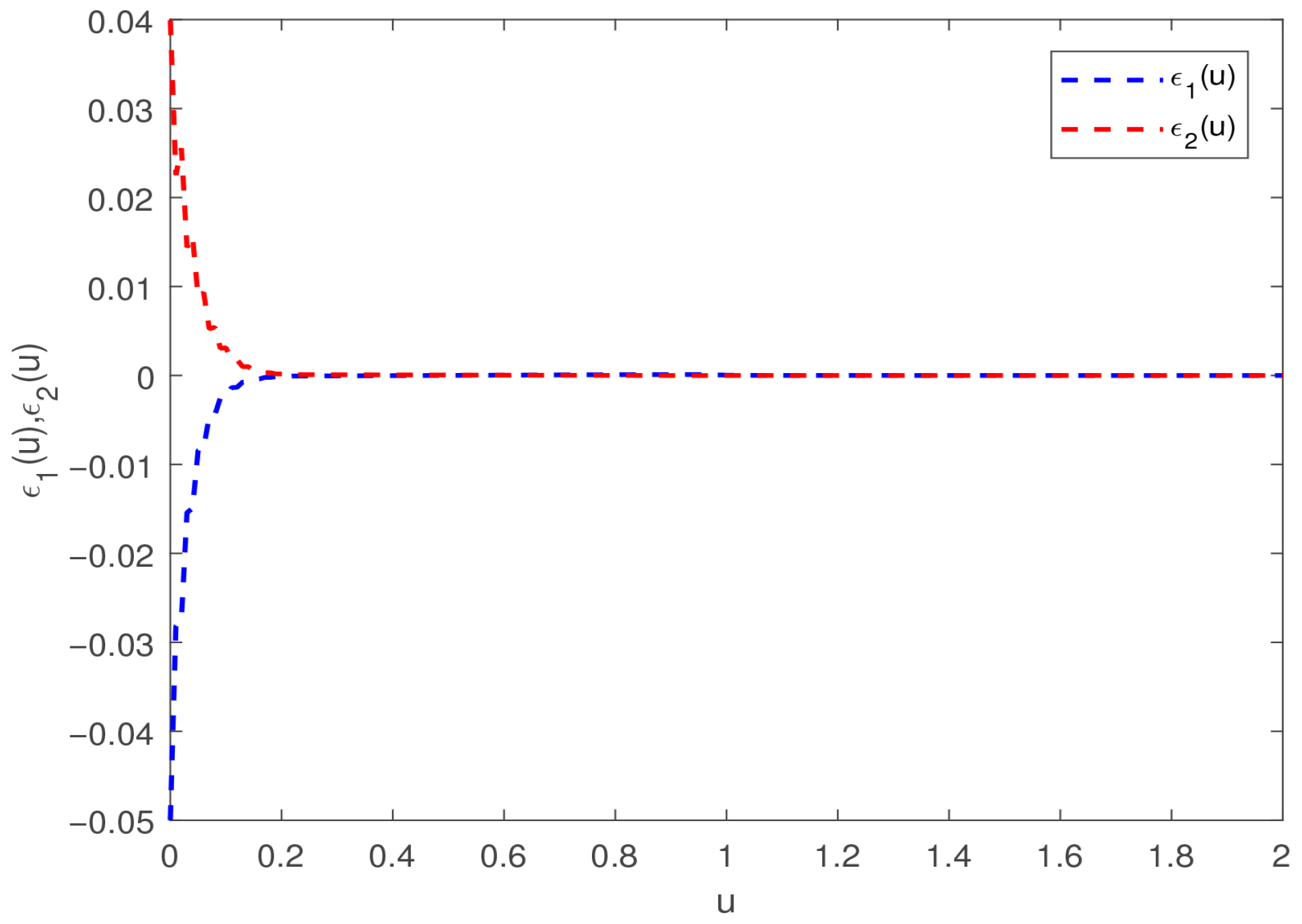 Example 1. Consider 2-dimensional fractional PDHNNs with bounded uncertainties as the primary system, which is described by Then, the consequential secondary system can be defined bywhere , , , . Giving the activation functions , we can check that Assumption 1 holds for . Let parameters , and . Through simple calculations, one can obtain , , , .