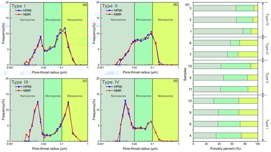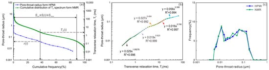 In this study, HPMI is applied strictly within the pore–throat size range where the method is generally considered reliable (above the ultra-nanopore scale). The characterization of pore–throats smaller than this range relies exclusively on NMR T2 spectra. By integrating the two datasets through cumulative matching, the pore–throat size distribution used in this work does not involve extending the HPMI model into pore–throat sizes for which it is not applicable.