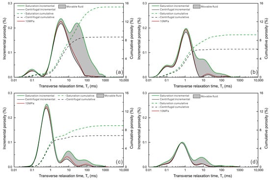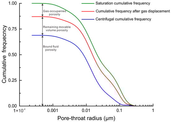 The T2 spectrum obtained under water-saturated and centrifugation conditions indicates the saturation and porosity of the movable and bound fluids in the sample [45,46]. The difference in the T2 spectrum is measured before and after water is displaced by nitrogen in the core, which can be used to determine the porosity occupied by gas and remaining fluid under displacement (Figure 3). The porosity occupied by the movable volume (Pmv) refers to the difference between the porosity under the water-saturated and centrifuged conditions. The gas-occupied porosity (Pog) is the difference of the T2 spectrum between the porosity under water-saturated conditions and the water-occupied porosity after water displacement by gas.