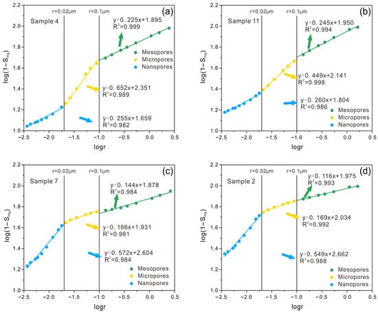 Fractal dimension fitting curve of different type samples based on high-pressure mercury injection method. (a) Sample 4, Type I pore-throat structure; (b) Sample 11, Type III pore-throat structure; (c) Sample 7, Type II pore-throat structure; (d) Sample 2, Type IV pore-throat structure.
