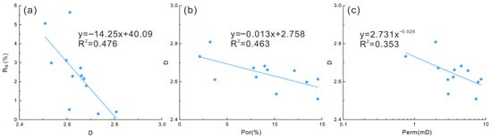 The fractal dimensions of different pore–throat scales and their contributions to reservoir properties show that mesopores have the highest average fractal dimension of 2.805 and contribute the most to reservoir properties, with porosity and permeability of 2.066% and 3.063 mD, respectively, indicating that the storage capacity and connectivity of the reservoir are mainly controlled by mesopores (Table 3). Micropores have a fractal dimension range of 2.348–2.882, with an average of 2.638, and their contribution to reservoir properties is second only to that of mesopores, suggesting that micropores exhibit relatively weak heterogeneity with a more uniform pore distribution, but their impact on reservoir properties is less than that of mesopores. Nanopores have an average fractal dimension of 2.619, which is between that of mesopores and micropores; due to their small size, their contributions to porosity and permeability are the lowest. The total fractal dimension of the samples ranges from 2.467 to 2.898, with an average of 2.642, reflecting a certain degree of heterogeneity in the reservoir pore–throat network.