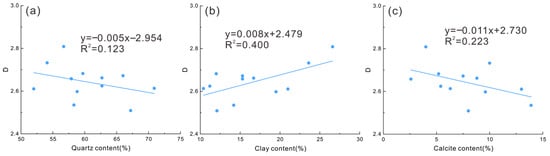 The influence of different mineral contents on the D of pore–throats at various scales shows significant variability (Figure 20). The quartz content shows an overall negative correlation with D across all scales, with the strongest correlation observed in mesopores. This indicates that quartz enhances the rigidity and compressive strength of the reservoir framework, leading to a more regular pore–throat structure, a more concentrated pore size distribution, and the preservation of mesopores (Figure 20a–c). Such structures are characterized by better connectivity and permeability, forming relatively low-D homogeneous systems that provide favorable physical spaces for gas accumulation and migration. Therefore, reservoirs with greater quartz content generally display higher porosity, greater permeability, and better gas-bearing properties. This feature is most evident in Type I samples—for example, sample 12, with a quartz content of 67.2%, shows a mesopores Sg of 3.787%, representing the highest gas-bearing capacity among all samples. In contrast, the clay mineral content shows a positive correlation with fractal dimension, particularly in micropores and nanopores (Figure 20d–f). This suggests that clay minerals, occurring in film-like, lamellar, or pore-filling forms, significantly increase the irregularity and heterogeneity of medium and small pore–throats, thereby enhancing the structural complexity of the pore–throat system but hindering the seepage of gas. The influence of calcite content on the fractal dimension at different pore–throat scales is relatively weak, indicating that calcite may play dual roles—either blocking pore–throats or regularizing their structure (Figure 20g–i). These opposing effects result in an overall insignificant impact of calcite content on D across different pore–throat sizes.