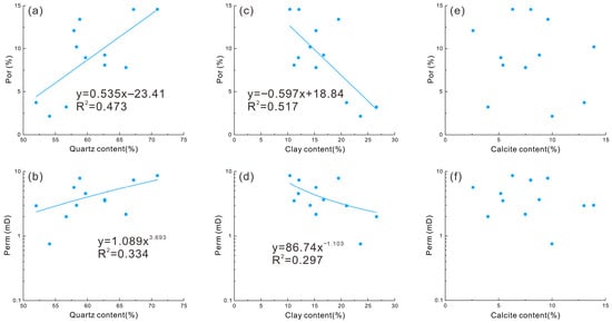 The porosity and permeability measurements for the 12 samples are shown in Table 1. The porosity and permeability exhibit a strong positive correlation (R2 = 0.842), indicating a high degree of coupling between reservoir property parameters (Figure 7). The variation in permeability is primarily controlled by porosity, reflecting the consistency between the two parameters in terms of pore–throat connectivity and fluid migration. Porosity is in the range of 2.12~14.55%, with an average of 8.99%. The permeability distribution is in the range of 0.75~8.62 mD, with an average value of 4.33 mD.