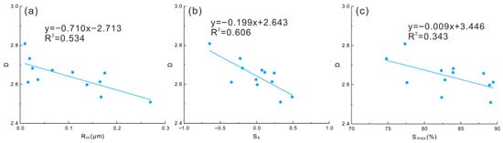 At different pore–throat scales, the fractal dimension (Dn) shows a clear negative correlation with pore–throat parameters, though the correlation strength varies depending on the scale and parameter type. Overall, Rm exhibits the strongest correlation with fractal dimension, with R2 values of 0.896 and 0.708 for mesopores and micropores, respectively. This indicates that larger average pore–throat radii correspond to more regular and homogeneous structures, resulting in significantly lower fractal dimensions (Figure 21a–c). Samples with well-developed mesopores exhibit concentrated pore–throat size distributions, greater connectivity, and lower flow resistance, reflecting reduced geometric complexity and, consequently, greater gas-bearing capacity. As the pore–throat scale decreases, the correlation between Rm and (Dn) weakens, suggesting that in finer pore–throats, the structure is more strongly affected by the mineral composition and clay filling, increasing geometric randomness and reducing the gas-bearing potential. Smax (maximum mercury saturation) also shows a negative correlation with the fractal dimension (Figure 21d–f). At mesopore scales, the correlation reaches 0.605, indicating that when mesopores are well developed, reservoir connectivity improves, the structure becomes more homogeneous, and the fractal dimension decreases. The presence of large pore–throats significantly enhances connectivity and permeability, promoting free gas accumulation and migration. Conversely, at nanopore scales, the correlation between Smax and D3 becomes weaker. This is because nanopores have poor connectivity and more dispersed pore–throat size distributions, which increase structural complexity and increase the fractal dimension, ultimately resulting in poorer gas-bearing capacity. Sk, which reflects the symmetry of the pore–throat size distribution, also shows a negative overall correlation with Dn (Figure 21g–i). When the pore size distribution is skewed toward the large-pore end, the system becomes more homogeneous, and the fractal dimension decreases. In contrast, when the skewness shifts toward smaller pores, the pore–throat distribution widens, heterogeneity increases, and the fractal dimension increases. This variation reveals the control of pore–throat distribution characteristics for gas occurrence: systems with a low fractal dimension correspond to reservoirs dominated by mesopores, with a higher proportion of free gas and stronger flow capacity; systems with a high fractal dimension correspond to reservoirs dominated by fine pore–throats, where complex structures favor adsorbed gas accumulation and hinder gas flow.