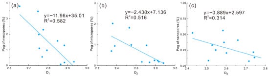 Relationship between the Pog of pore-throats with different sizes and the fractal dimension Dn of them. (a) Relationship between Pog of mesopores and D1; (b) relationship between Pog of micropores and D2; (c) relationship between Pog of nanopores and D3.