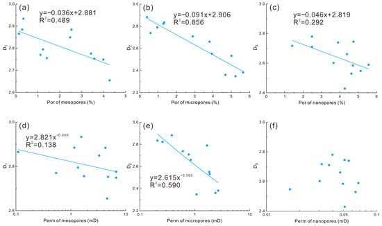 Relationship between the fractal dimension Dn of pore-throats with different sizes and their contribution to physical properties. (a–c) Relationship between fractal dimension Dn of pore-throats with different sizes and their contribute porosity; (d–f) relationship between fractal dimension Dn of pore-throats with different sizes and their contribute permeability.