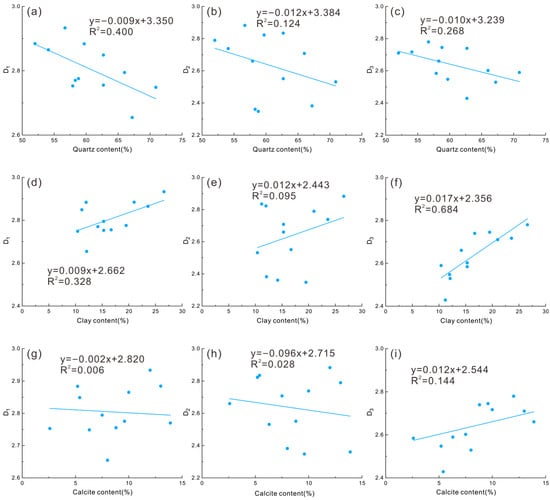 Relationship between the fractal dimension Dn of pore-throats with different sizes and mineral content. (a–c) Relationship between fractal dimension Dn of pore-throats with different sizes and quartz content; (d–f) relationship between fractal dimension Dn of pore-throats with different sizes and clay content; (g–i) relationship between fractal dimension Dn of pore-throats with different sizes and calcite content.