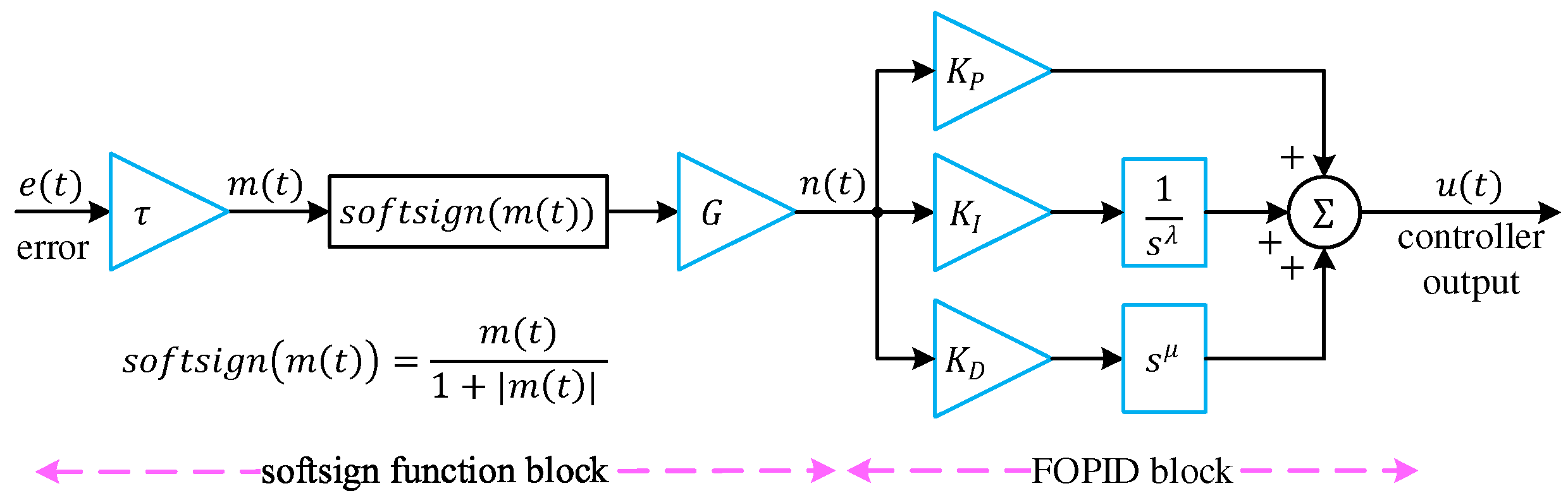 The transfer function of the FOPID controller has already been defined in the previous subsection by Equation (25). This generalized structure provides a wider tuning range than a conventional PID by allowing non-integer exponents that shape the frequency response more flexibly and improve robustness to parameter variations. To introduce nonlinear adaptability, the FOPID stage is preceded by a softsign function [