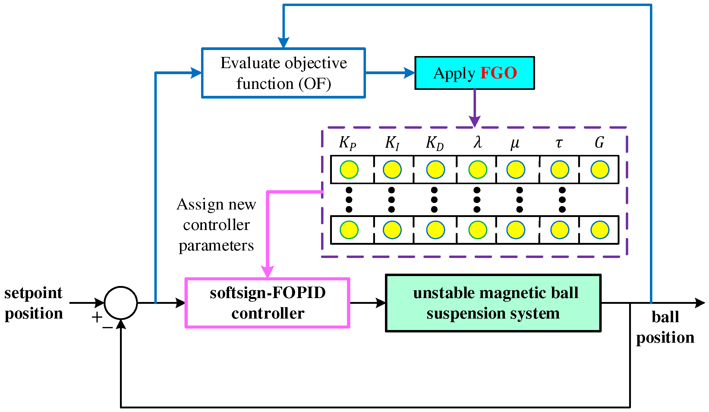 The integration of the FGO with the softsign-FOPID controller for the magnetic ball suspension system is schematically illustrated in