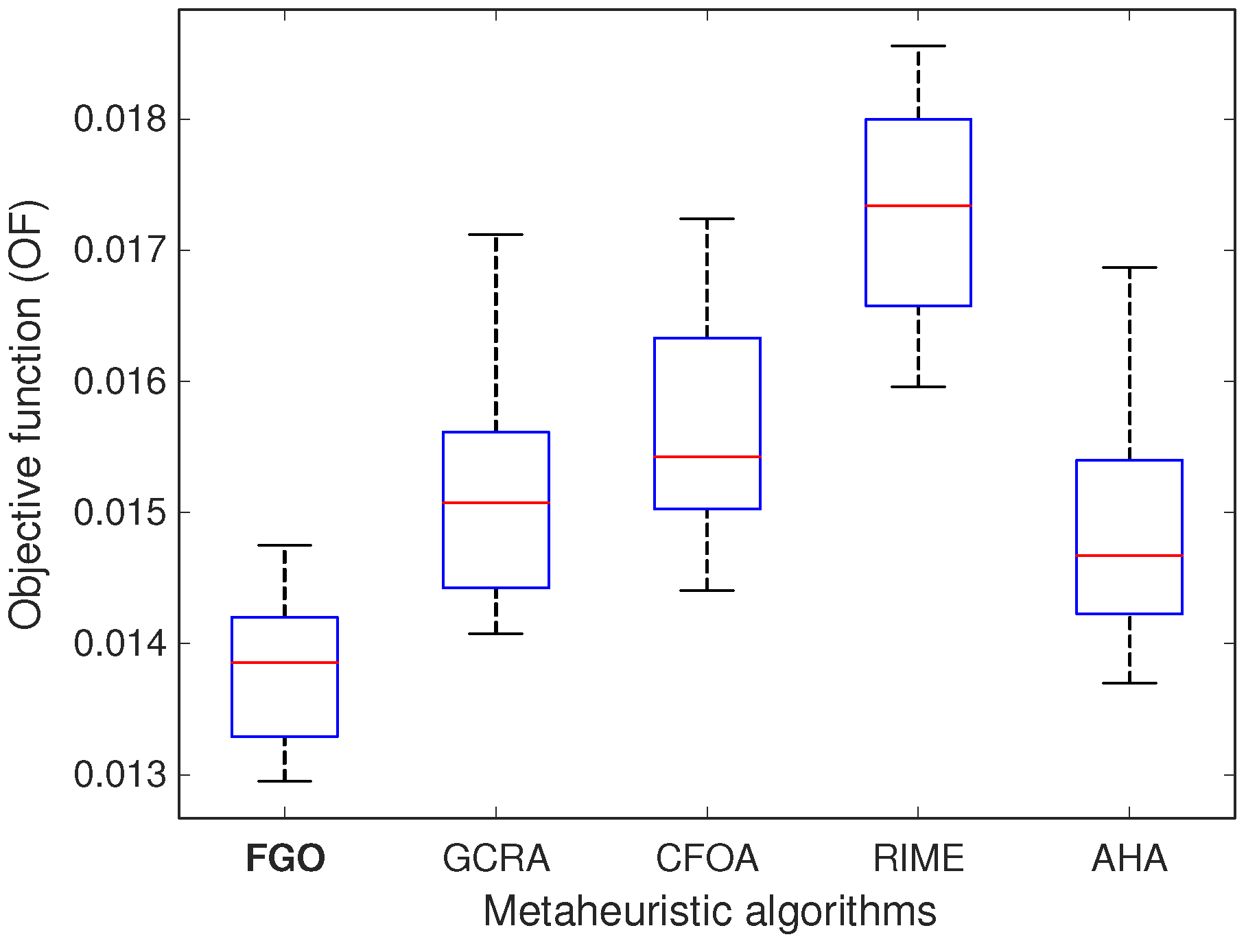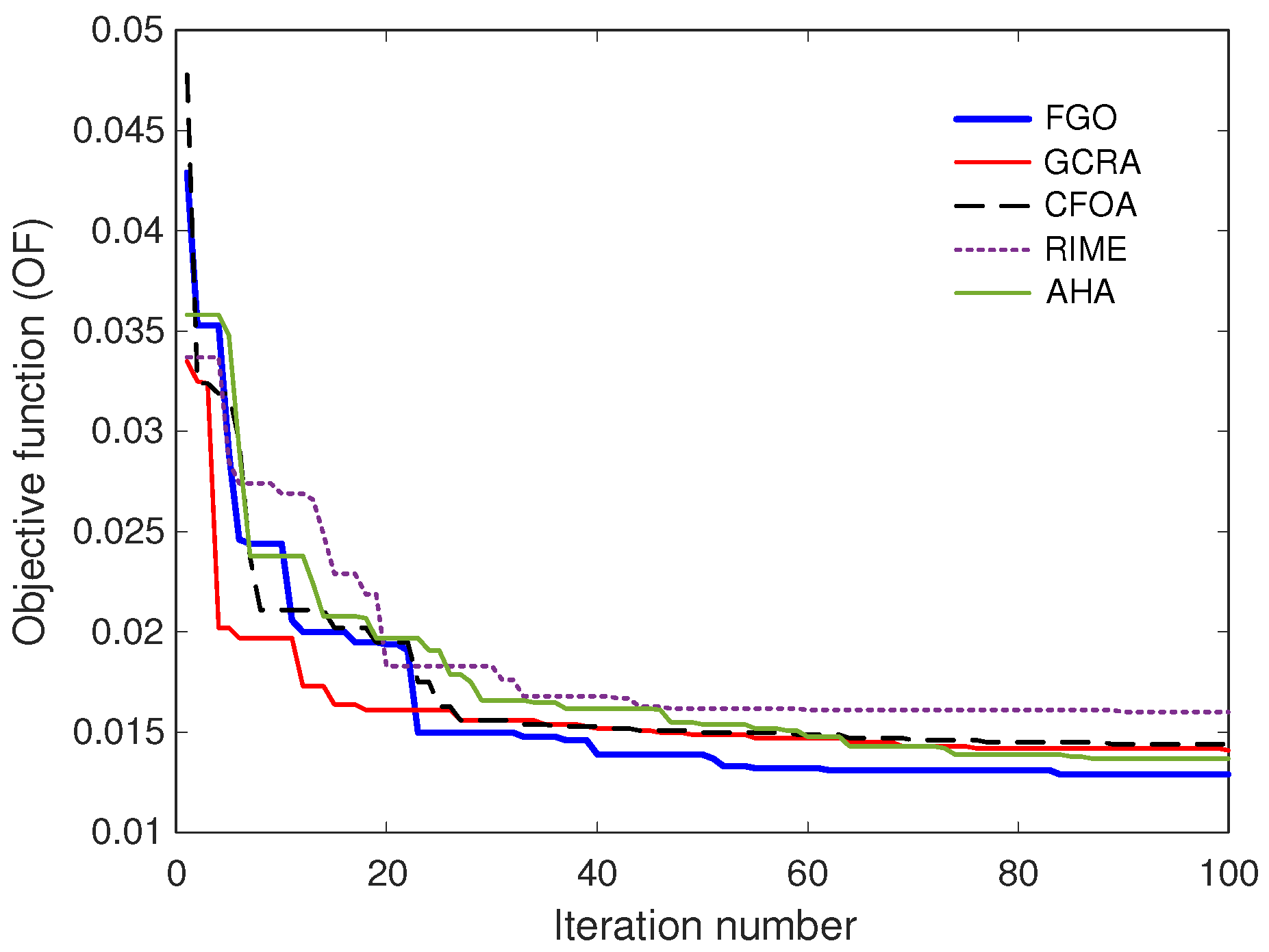 The optimization process operates concurrently with the control loop. Initially, FGO generates a population of candidate parameter sets for the seven controller variables Each candidate solution corresponds to a different tuning configuration of the softsign-FOPID controller. For every candidate, the control system is simulated, and the resulting transient response is evaluated through the objective function defined in Equation (28). The objective function computes the performance index by using the system output and the instantaneous error. The resulting objective value is then passed to the FGO, where the optimization algorithm updates the controller parameters based on the fungal growth mechanism. The newly generated parameter set is reassigned to the controller, and the process repeats until the termination criterion is met. Through this iterative tuning procedure, the FGO effectively explores the multidimensional parameter space and identifies the optimal combination of controller gains and fractional orders that minimize the objective function. The interaction between the optimizer and the control loop ensures that the system’s transient and steady-state characteristics such as overshoot, rise time, and steady-state error—are simultaneously improved.
