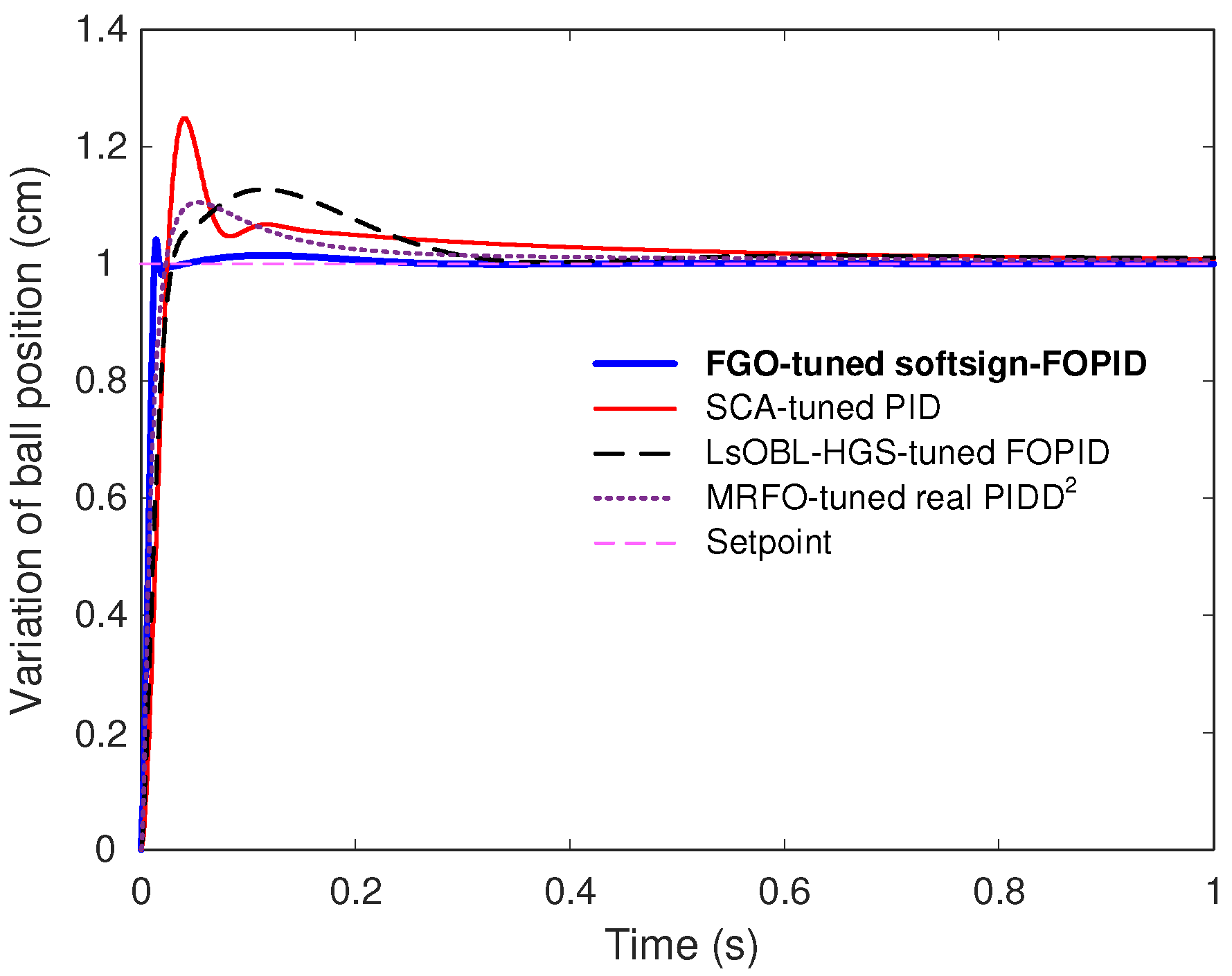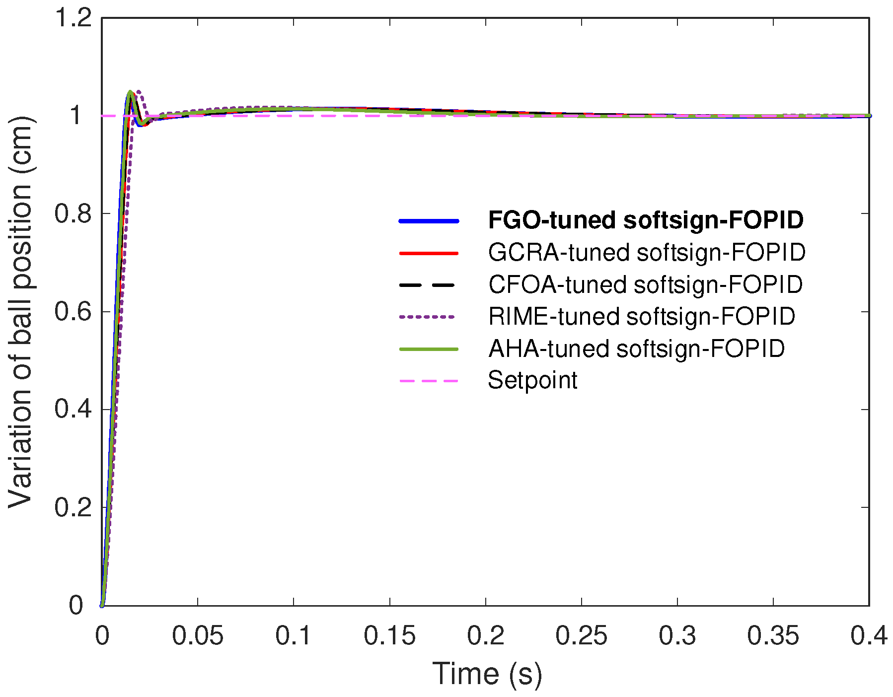 This third-order transfer function clearly demonstrates the unstable nature of the system due to the positive pole. Therefore, without feedback control, even small deviations from the equilibrium cause the ball to diverge rapidly from its suspended position. The derived model serves as the foundation for developing and tuning advanced controllers such as the FGO-optimized softsign-FOPID proposed in this work. It provides the dynamic representation required for simulating control performance, designing objective functions, and performing stability and robustness analyses.