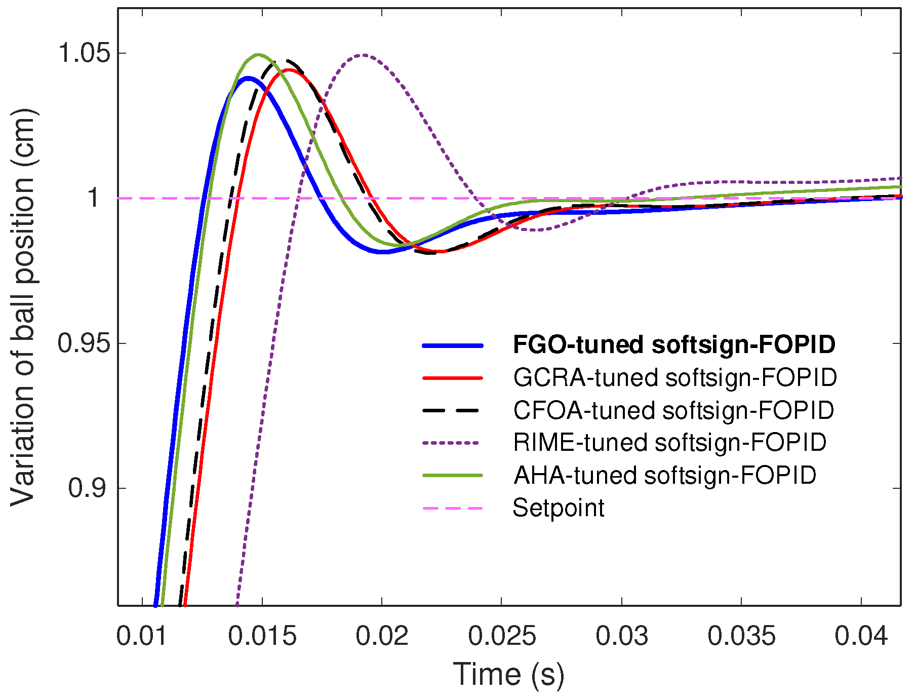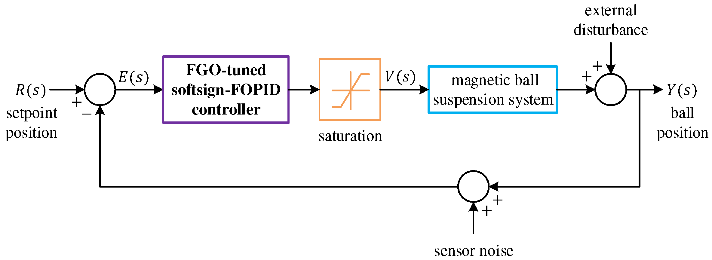 To address these gaps, this study proposes a softsign fractional-order PID (Softsign-FOPID) controller, optimized via the FGO, for precise and robust control of the magnetic-ball suspension system. The softsign function provides a bounded and continuously differentiable nonlinearity that smooths control signals while preserving steady-state accuracy. The FGO algorithm ensures adaptive and consistent convergence by balancing global exploration and local exploitation. The main contributions are as follows considering the above discussion: